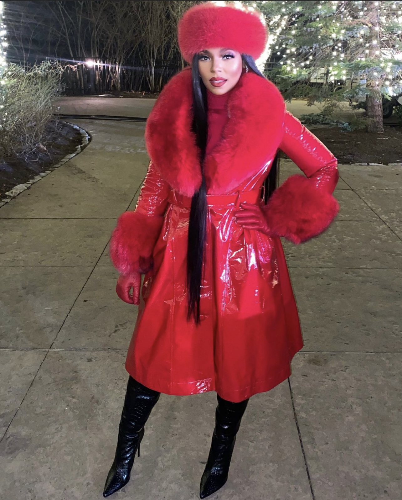 Ashanti wore a custom coat by Daniel’s Leather which appeared in red leather along with faux fur trims on the collar and cuffs. She also rocked a custom red faux fur hat by the coat designer as well. Further adding to the red vibe of the look, she wore a red turtleneck and gloves. Completing the look, she went with a pair of $479 Jennifer Le Black Caiman II boots. Her look was styled by Tim B.