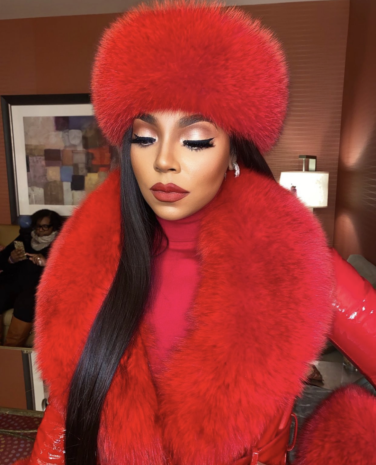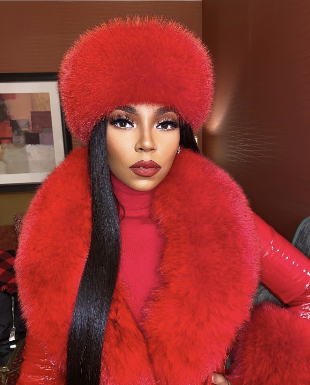 Ashanti Delivers Ultimate Holiday Glam for Performance at Foxwoods Resort Casino: Red Style Moment Featuring Custom Daniel’s Leather Faux Faur and Leather Coat and Hat Paired With Jennifer Le Black Croc Embossed Boots