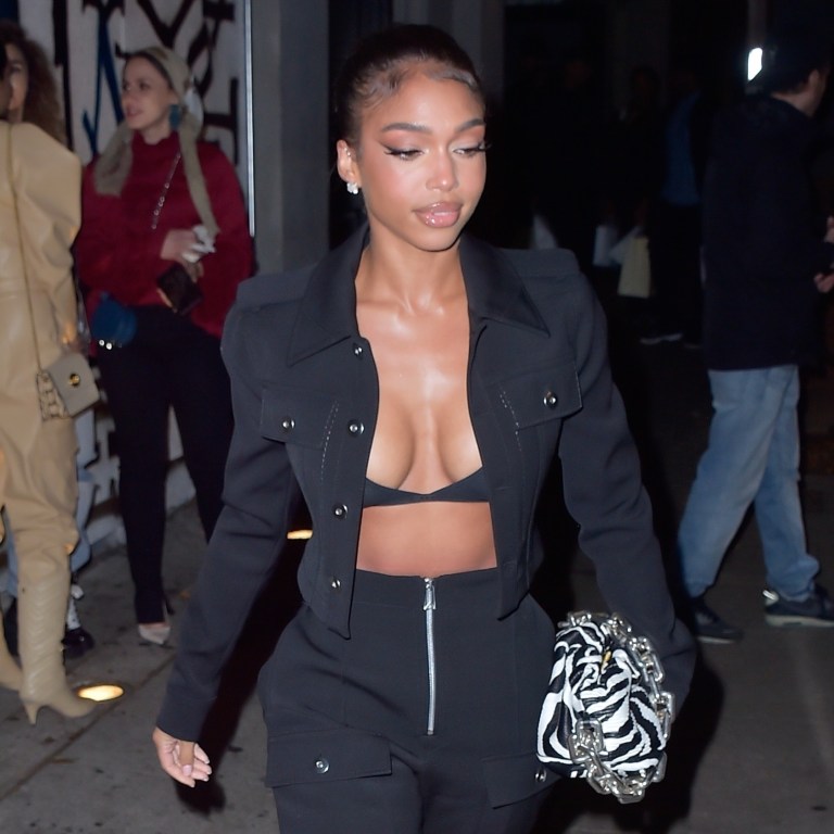 Lori Harvey wore a $9,450 Bottega Veneta belted-waist leather trench coat paired with a Wolford black turtleneck top and leggings. For accessories, the model went with Louis Vuitton “Patti” wedge boots, an orange Hermès Kelly handbag and crystal hoop earrings.