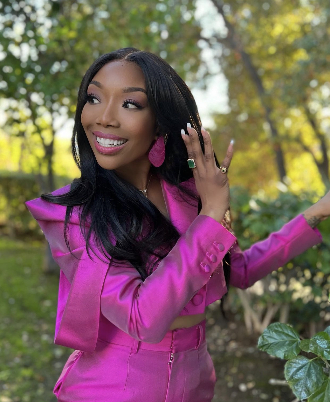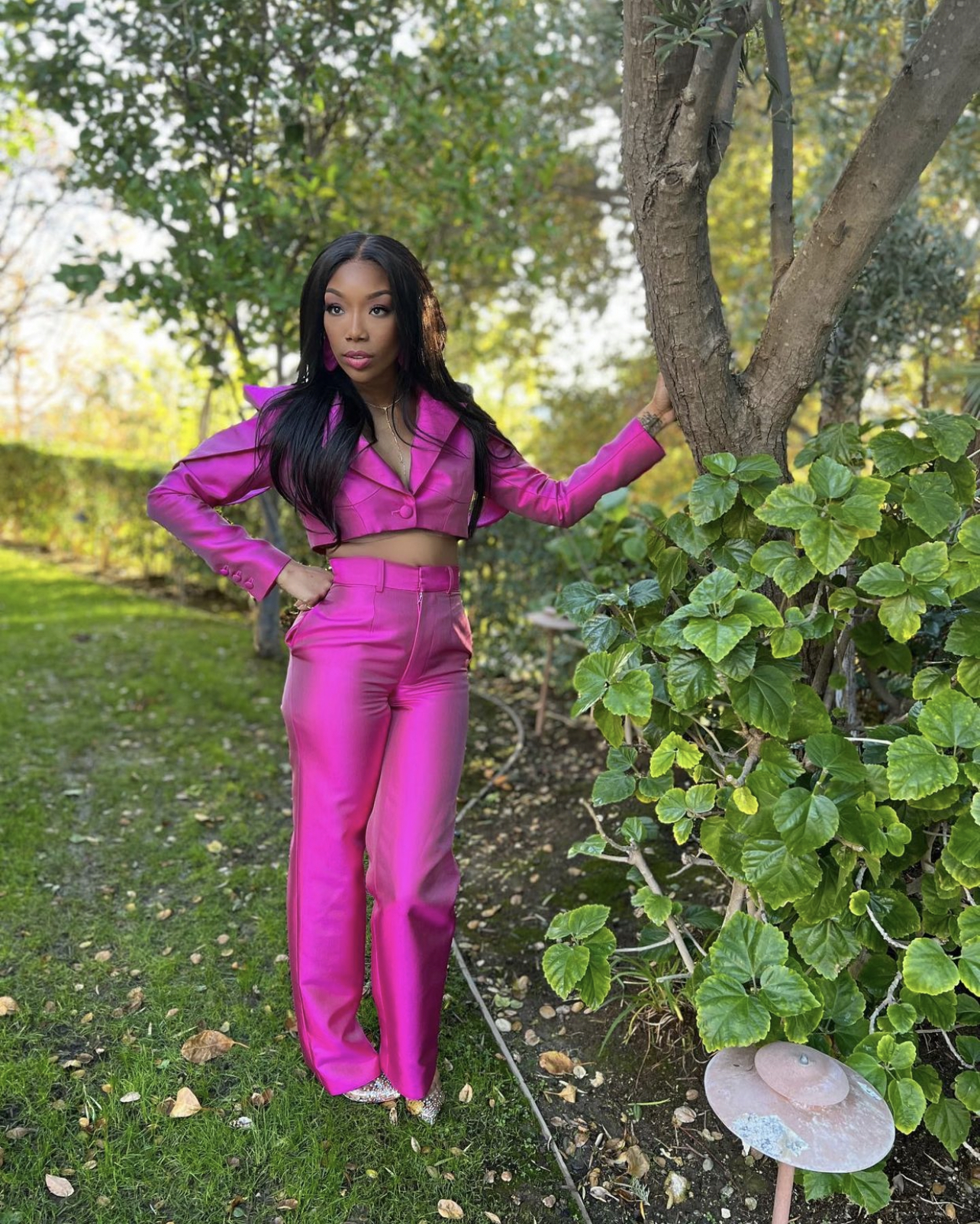 Brandy struck a pose in an Aliétte Fall 2021 suit, including the $1595 strong-shoulder bustier cropped suit jacket and straight-let trousers. The dazzling pink suit was paired with $1,095 Christina Louboutin Spikaqueen heels. For accessories, the singer wore Jude Benhalim earrings and a Shay Jewelry necklace and rings. Her look was styled by Ashley Sean Thomas and assisted by Stephanie Andrea.