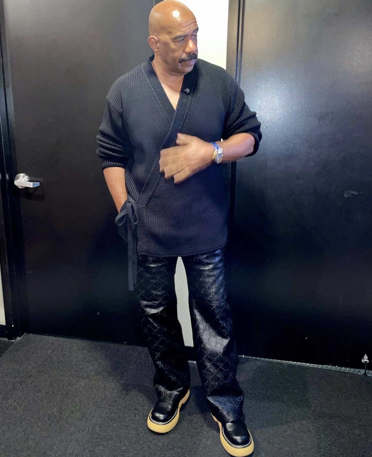 Steve Harvey wore a $1,295 Dunhill cotton texture wrap cardigan paired with $4,600 Gucci GG leather pants and what appears to be $1,100 Bottega Veneta “Swell” boots. His look was styled by Elly Karamoh, our 2021 Faby’s Stylist of the Year.