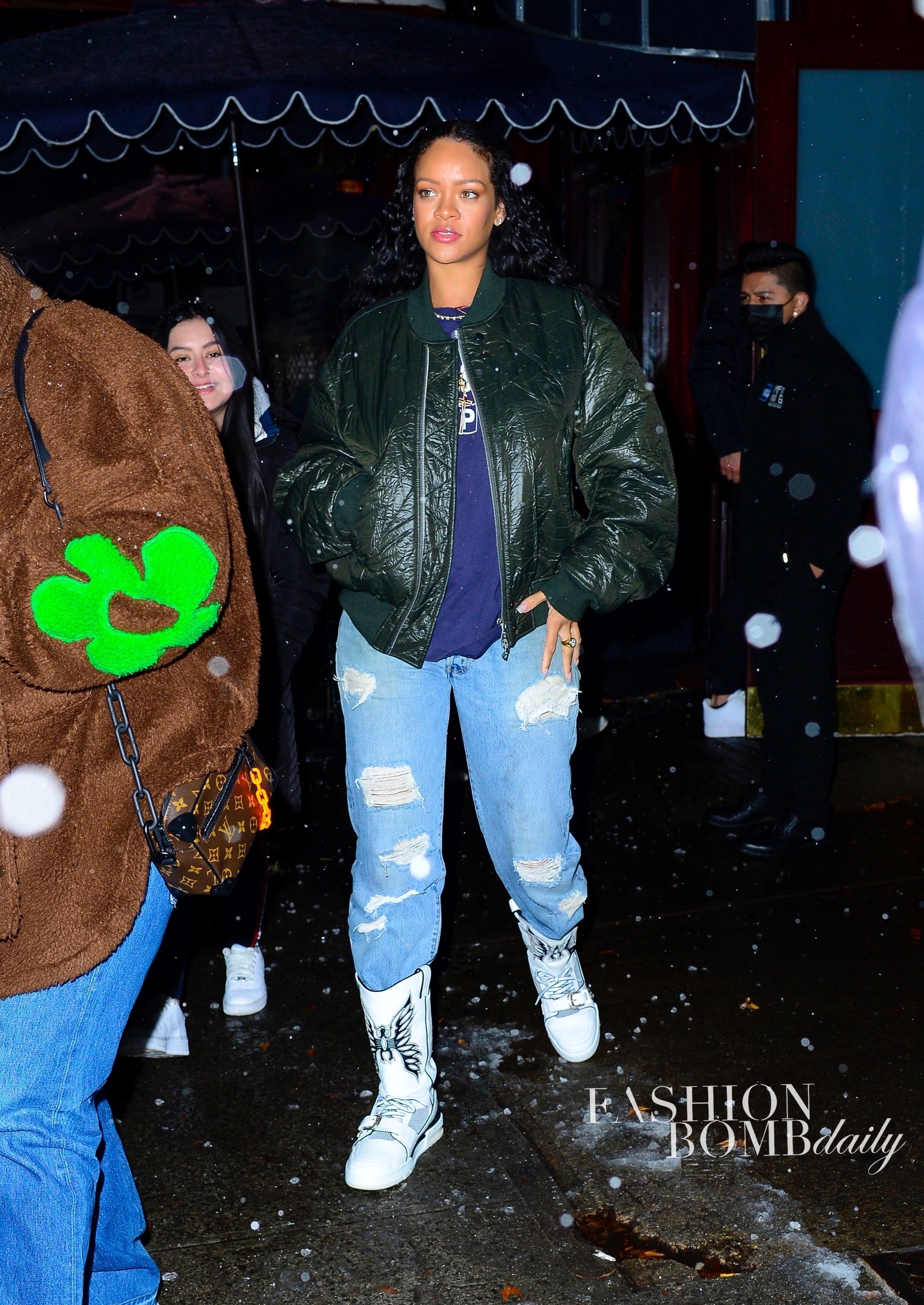 While we don’t know the status of Rihanna’s womb, we do know that she stepped out in snowy NYC wearing ASAP Rocky’s Dries Van Noten jacket and $3,900 Louis Vuitton Sneaker boots.