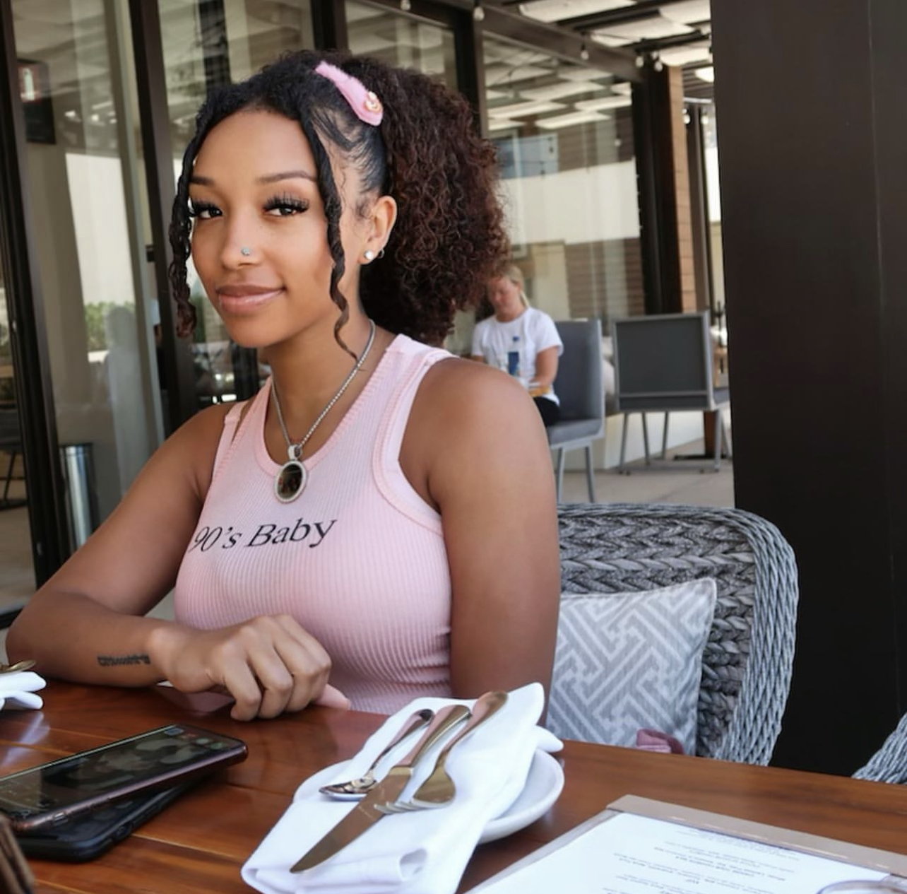 Zonnique Pullins wore Fashion Nova’s $19.99 90’s Baby Tank Top. She paired the tank top with denim chain-detail shorts, a fuzzy pink hair clip, and picture pendant necklace.