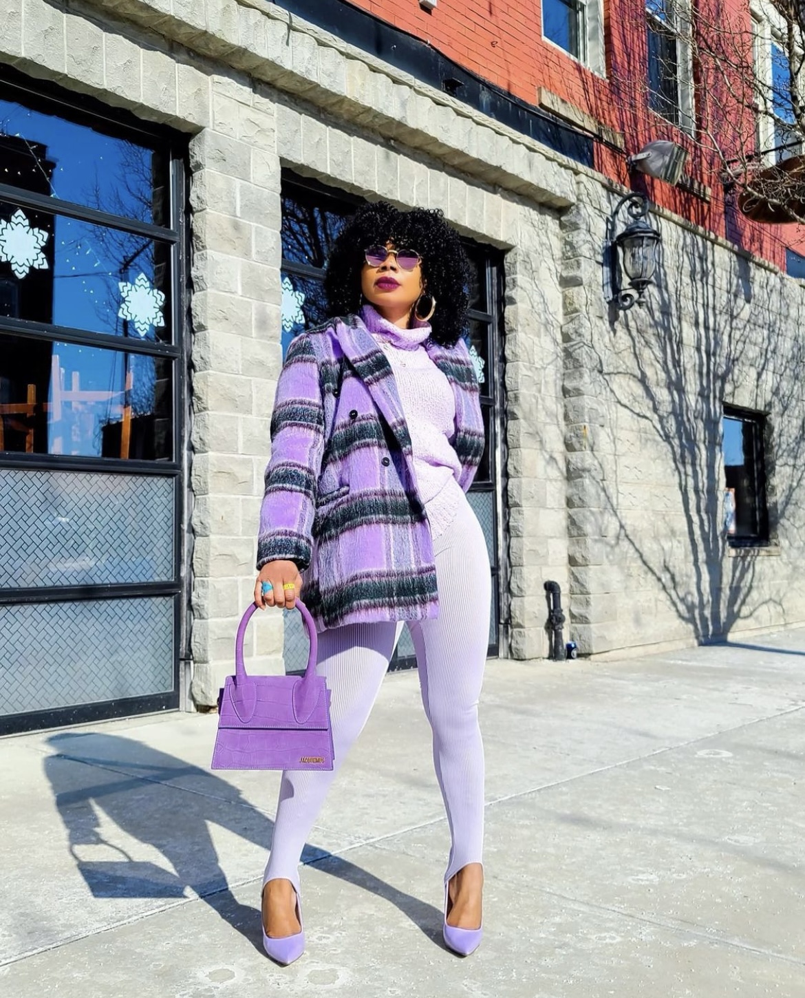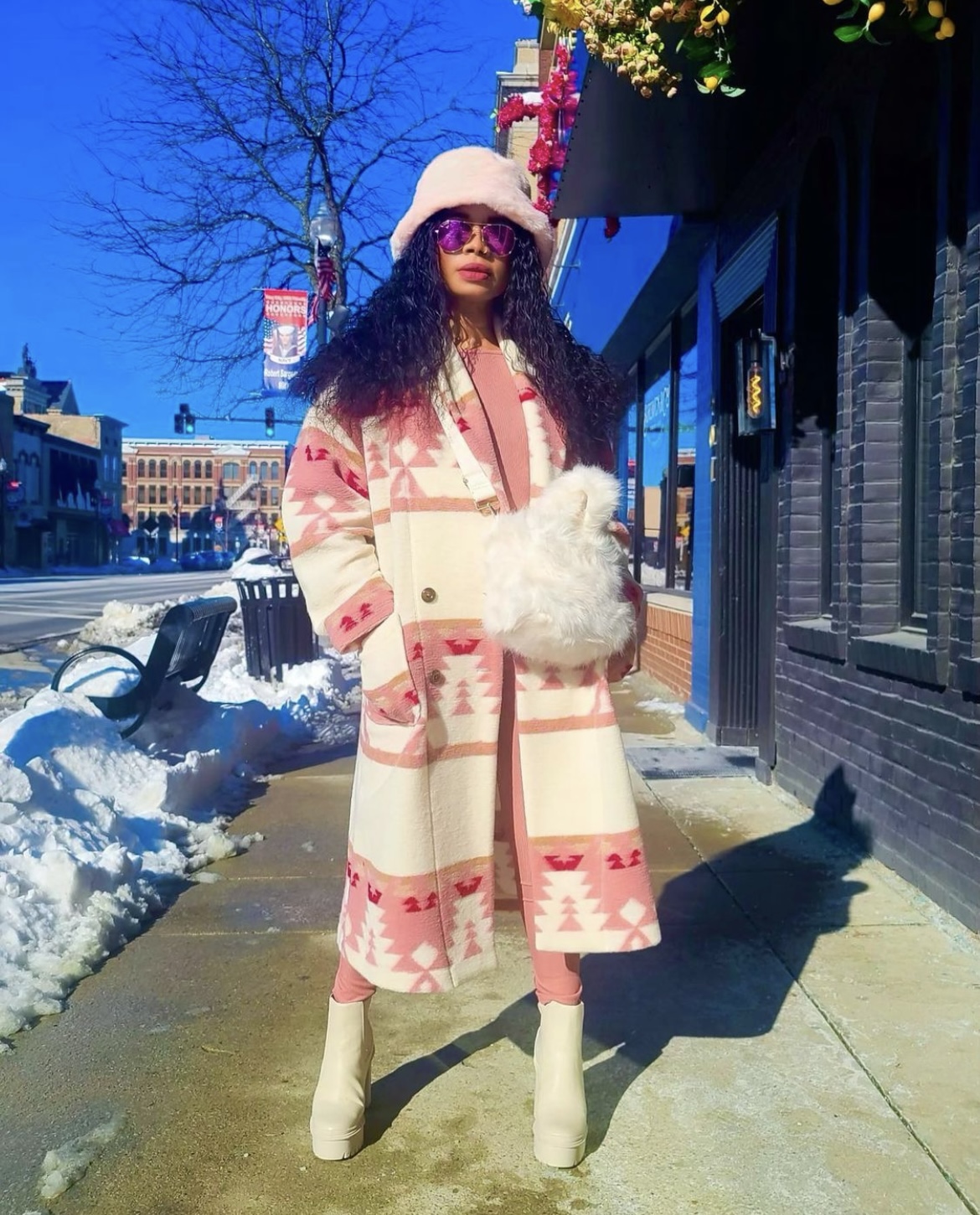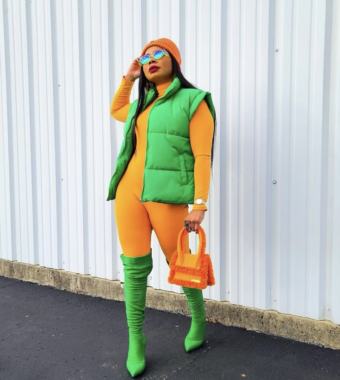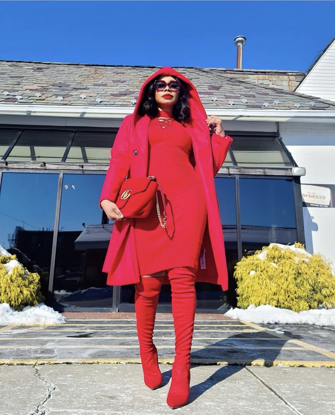 Her style is very bold and colorful. She thrives in monochromatic looks and rocks the latest accessory trends from fur bags to silhouette enhancing outer wear. Each look is a statement.