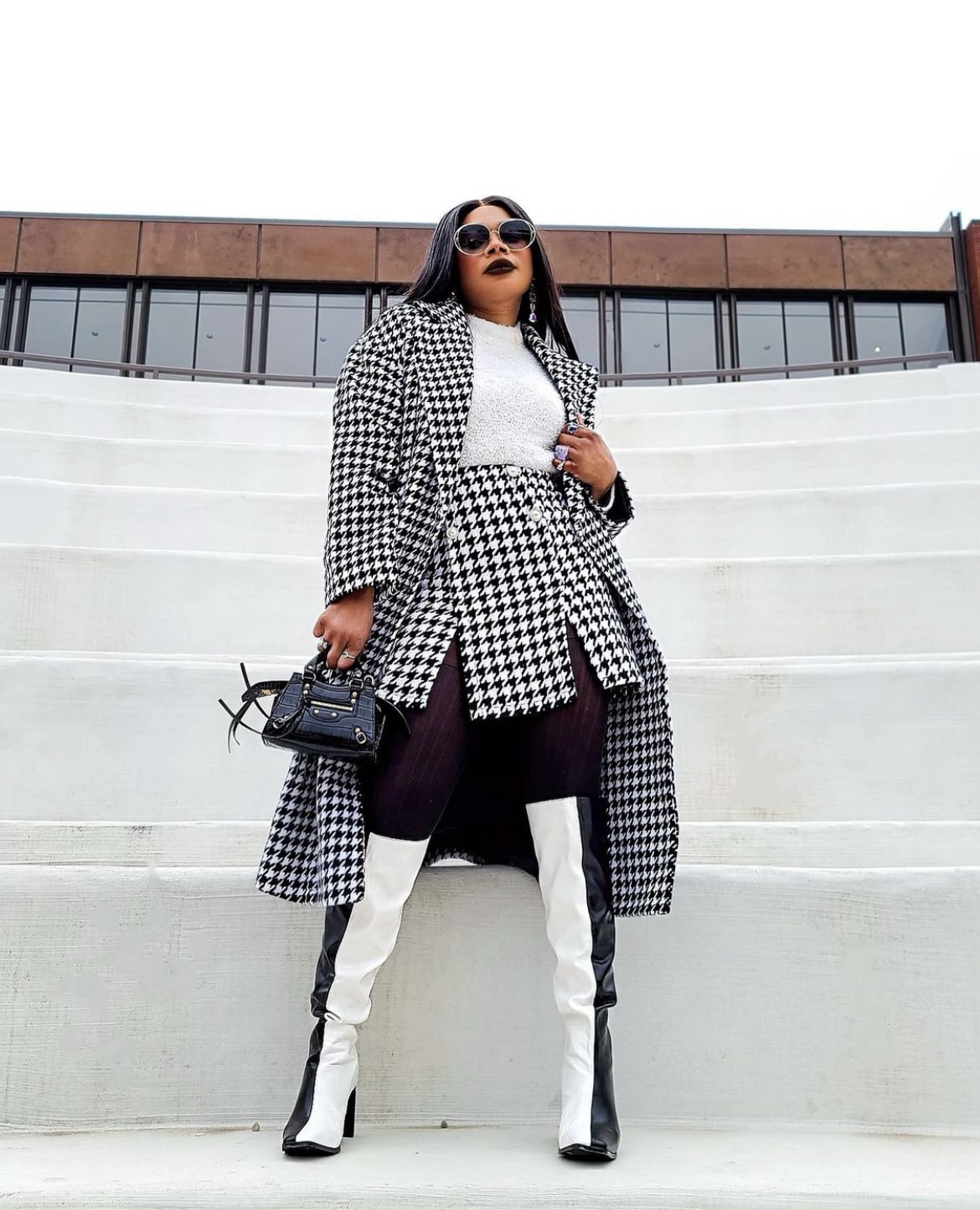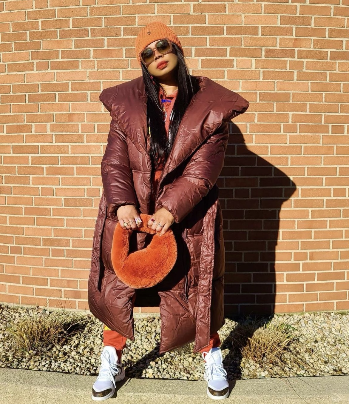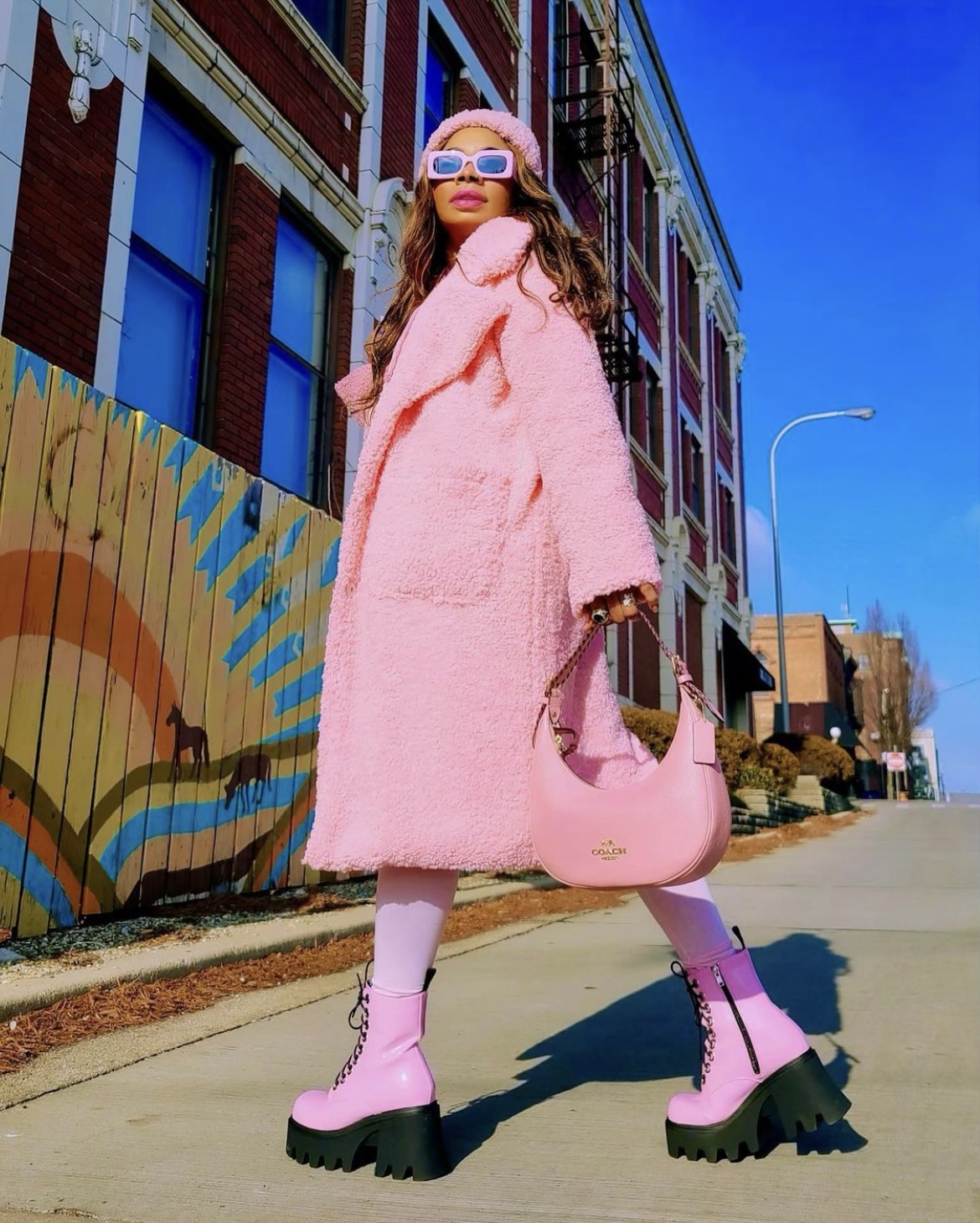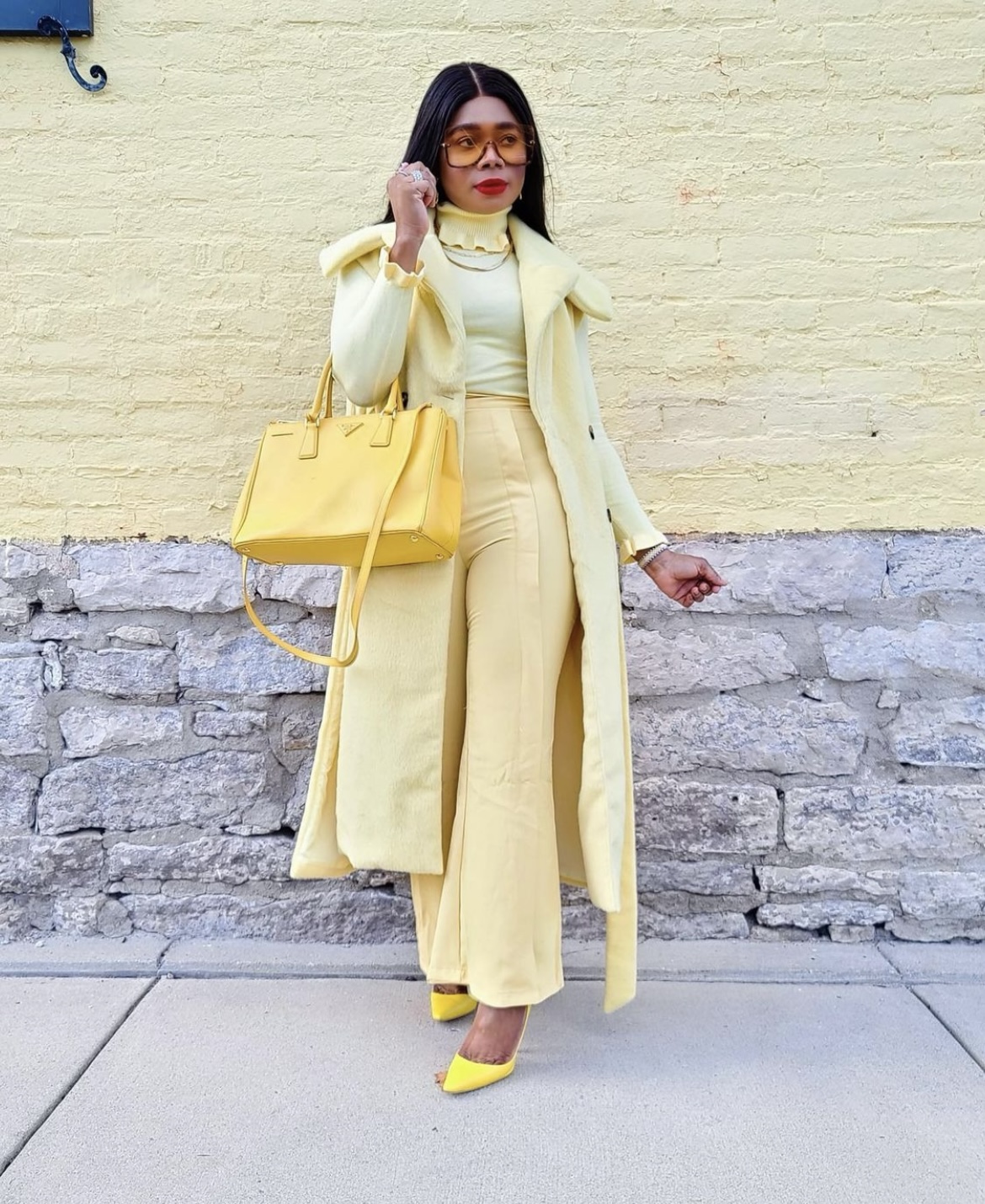 Her style is very bold and colorful. She thrives in monochromatic looks and rocks the latest accessory trends from fur bags to silhouette enhancing outer wear. Each look is a statement.