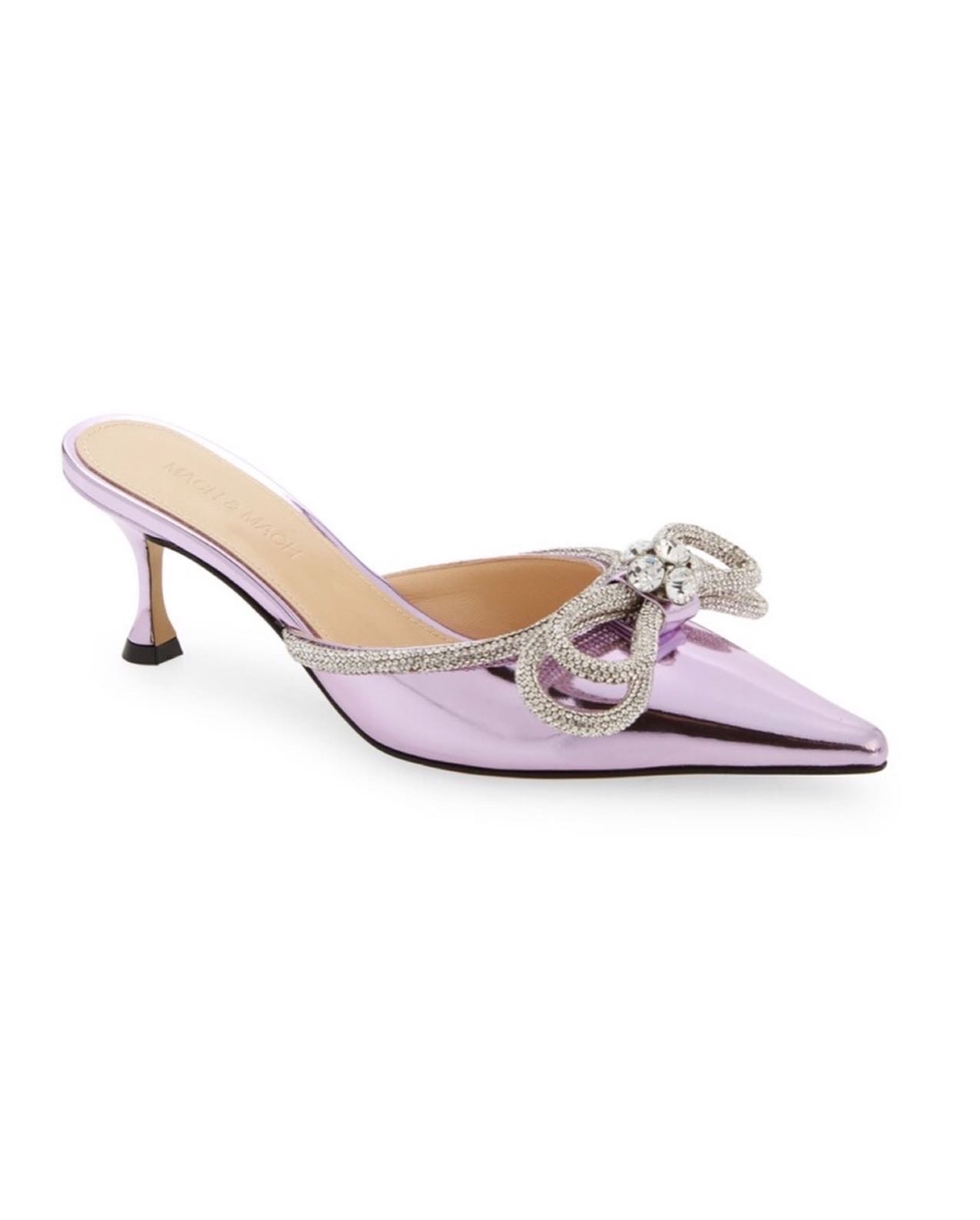 Her Double Bow mules are crafted of iridescent leather with a crystal-embellished bow at the vamp.