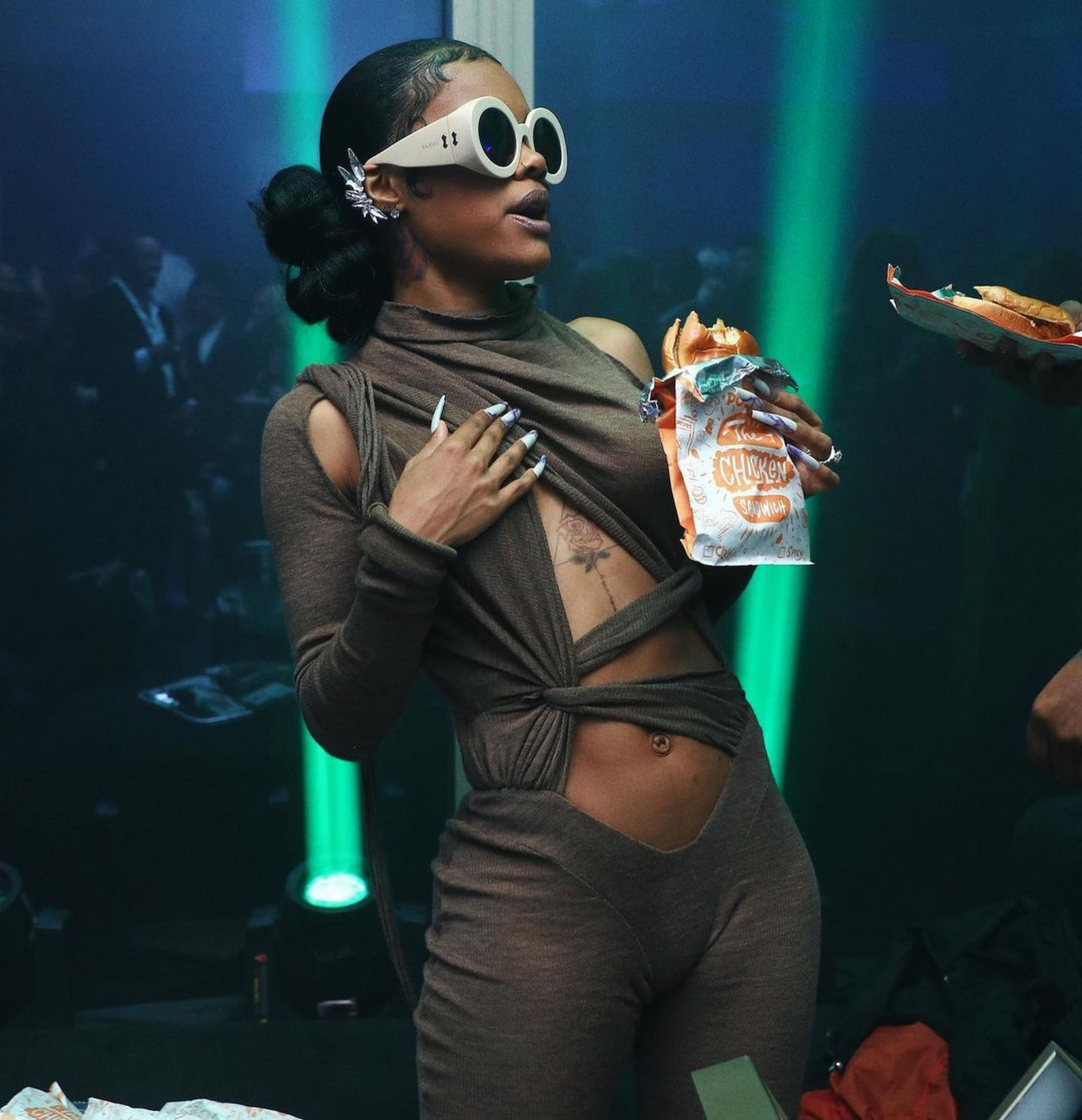 Teyana Taylor indulged in a delicious looking Popeyes sandwich wearing a Laquan Smith Fall 2022 look.