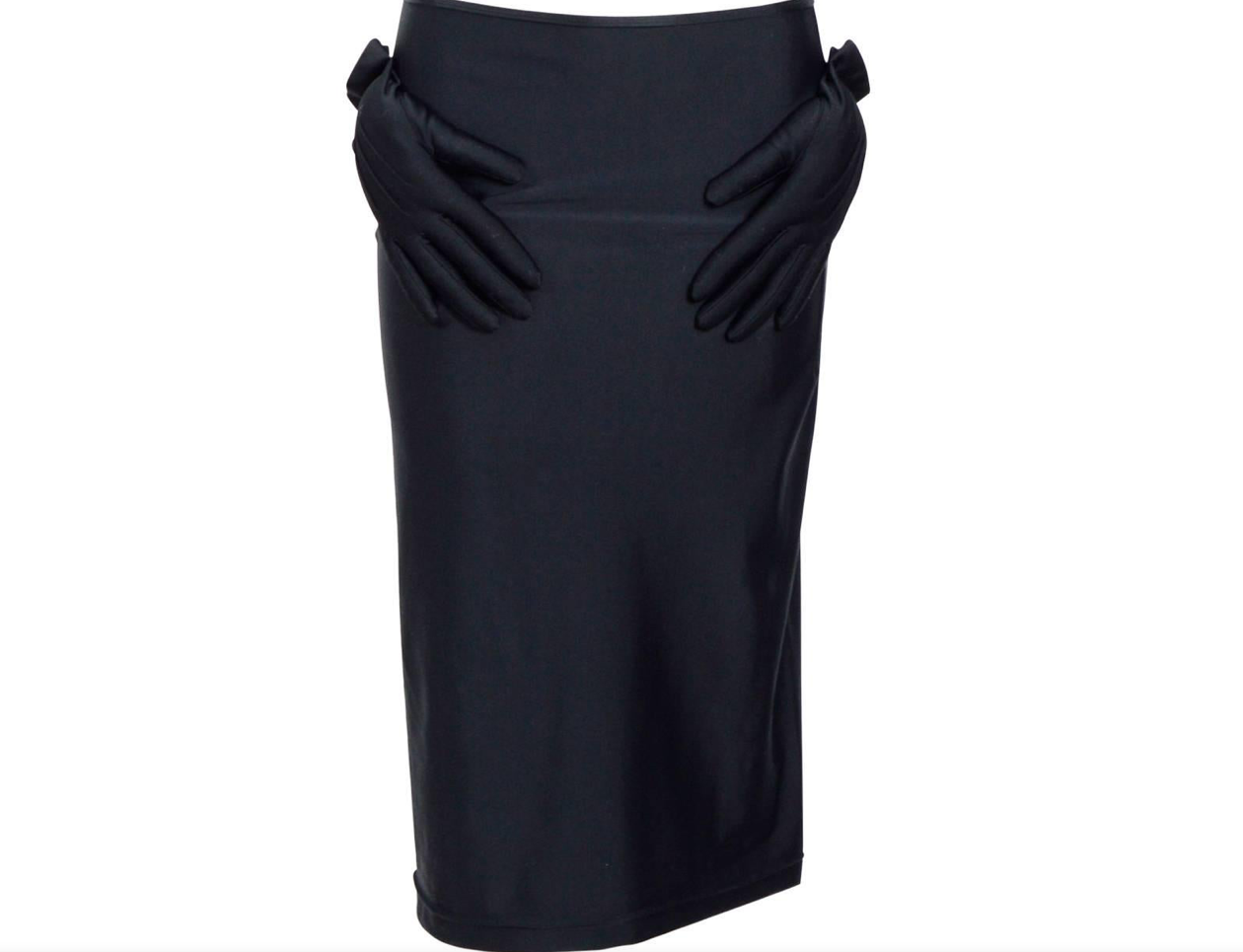 The head turning ensemble hails from the brand’s Fall 2007 collection. The look features hands the appear to encroach on Kylie’s chest and hips. Her jacket was last spied on 1stDibs.com for $1,470; a longer version of her skirt for $1,650.
