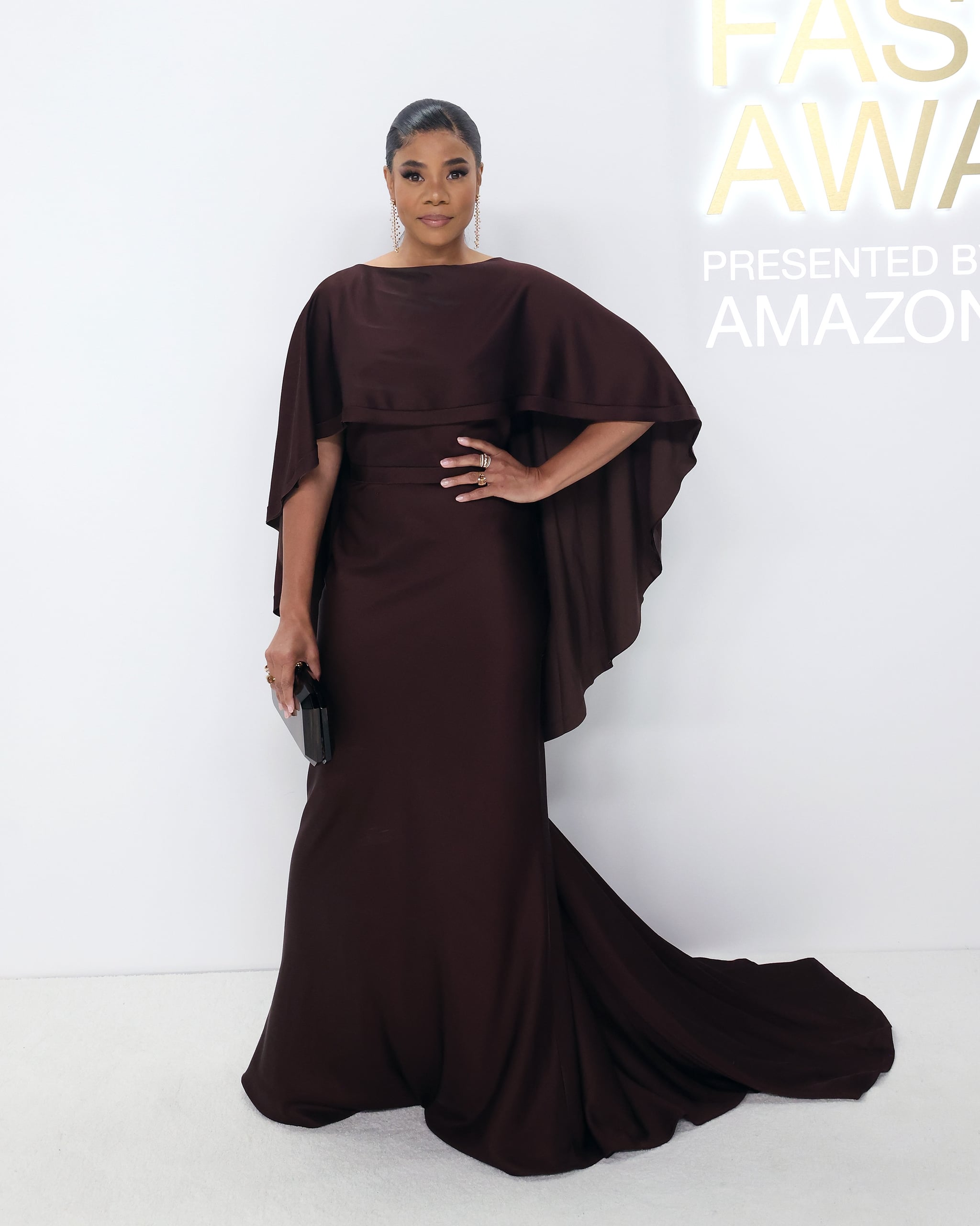 Elegance was the name of the game in regards to Regina’s Wu look. The rich chocolate brown complements her skin beautifully while the cape sleeves add a touch of refinement to the look.