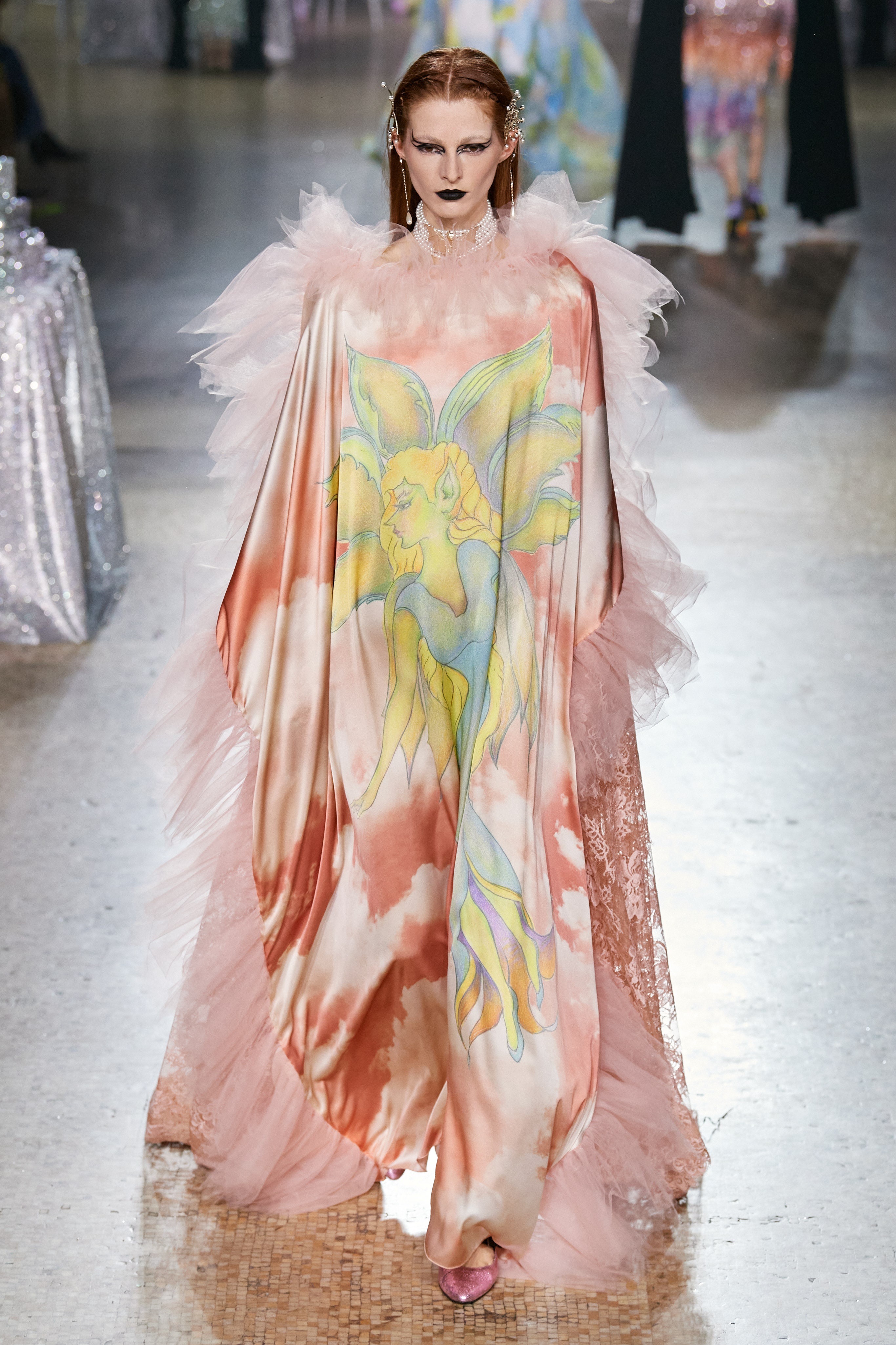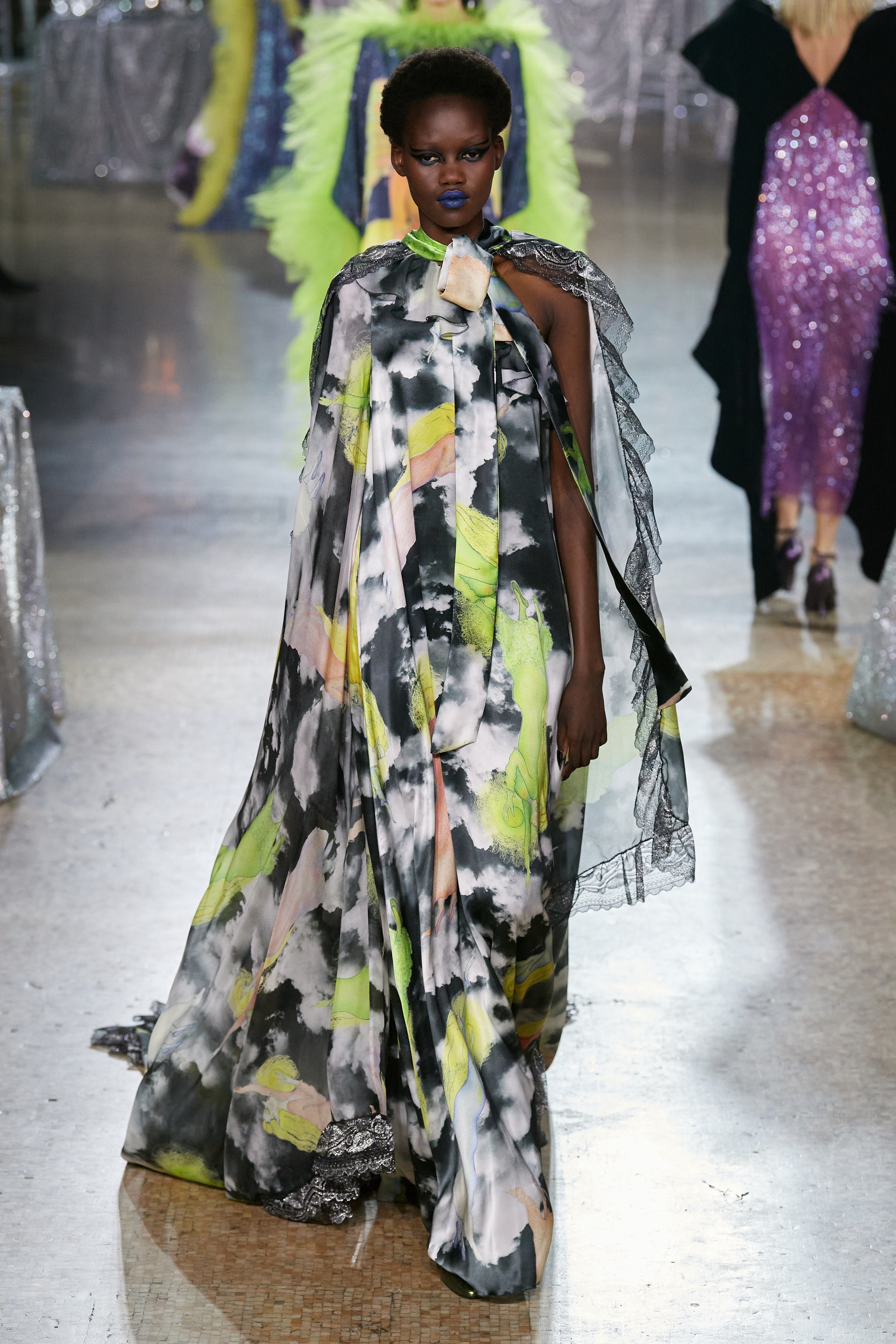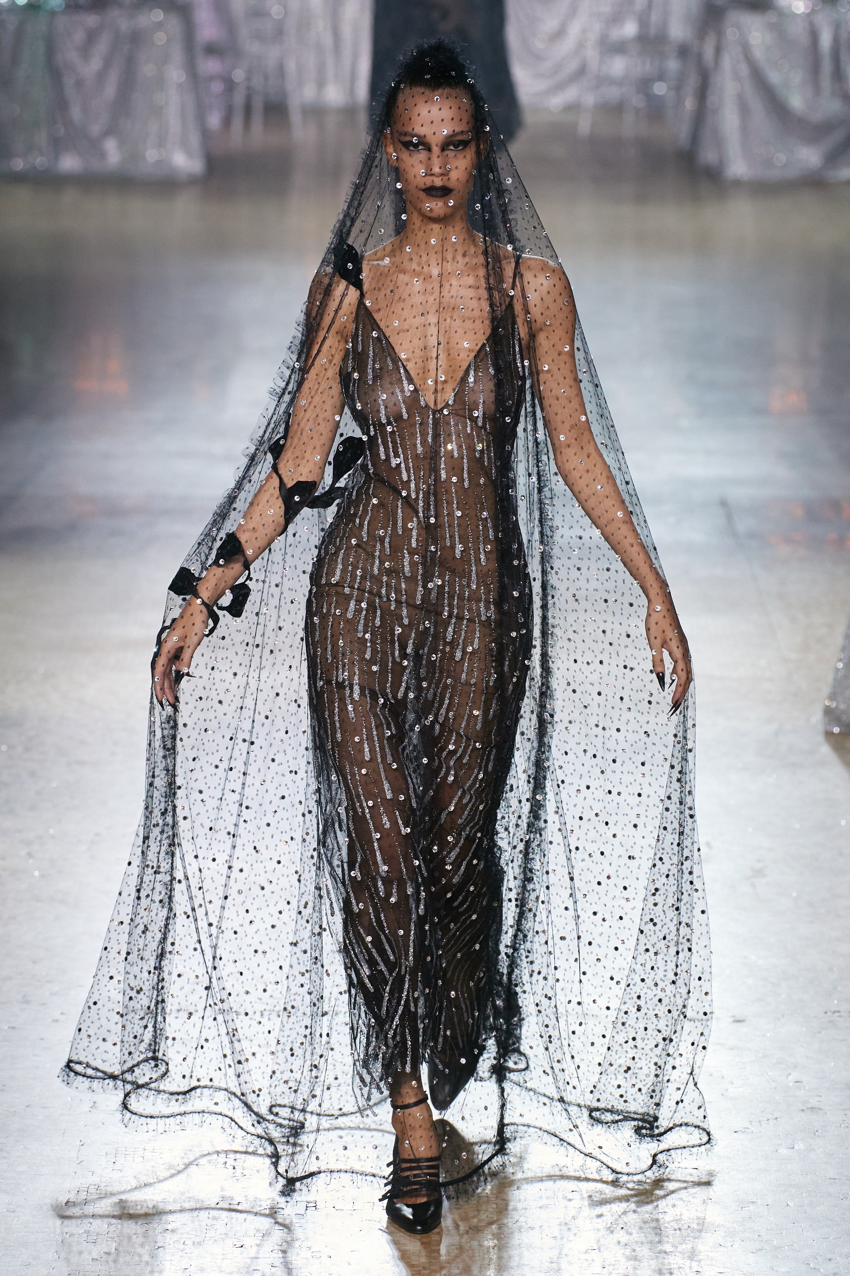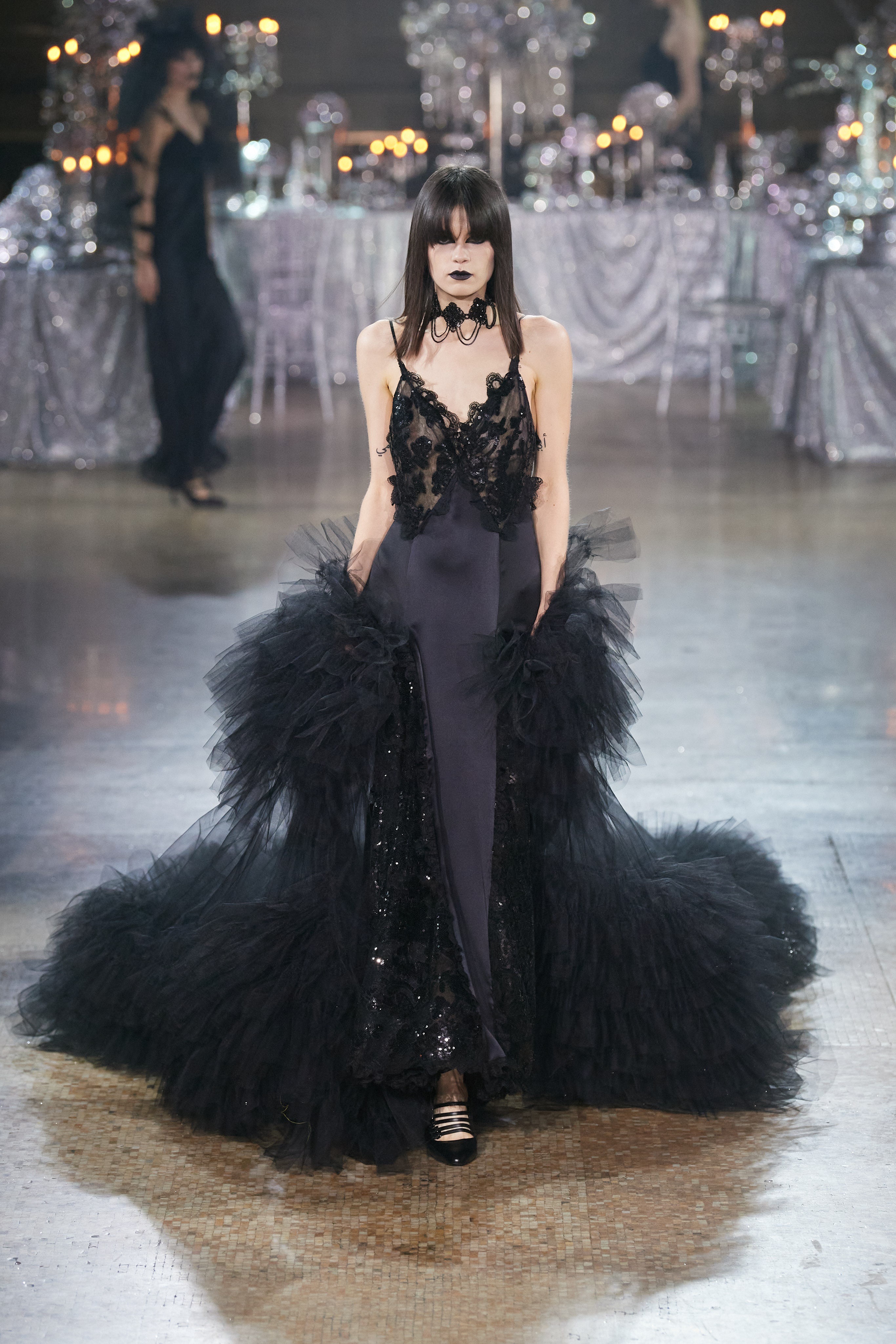 Black V-shaped lace insets, mutton, sleeves, and double-breasted wool coats, touch on a Victorian feel, while beaded slip dresses and full tulle robes speak to an Old Hollywood glam.
