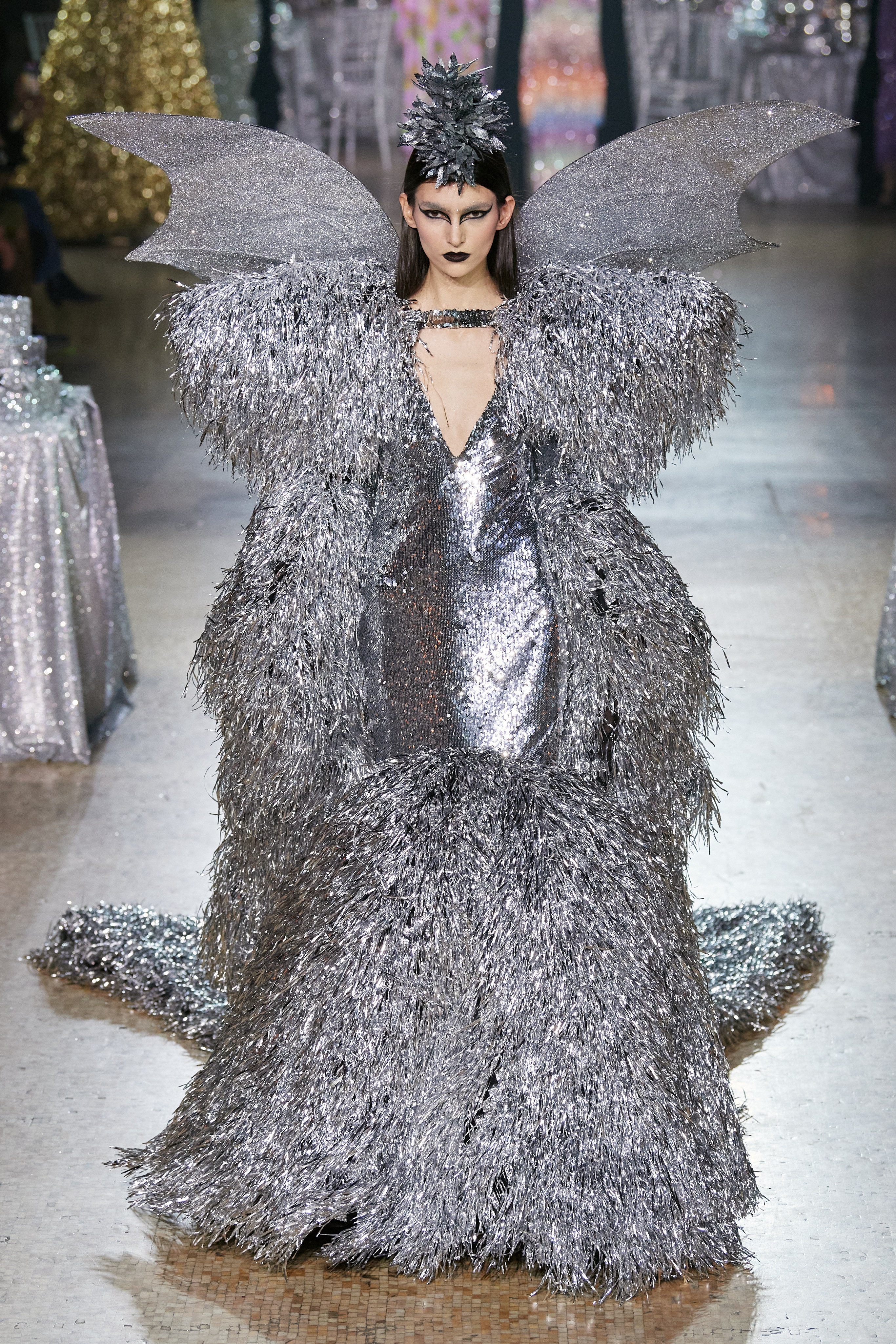The collection was already a spectacle, but the real drama came when over-the-top metallic fringe made its way down the runway in the shape of bold shoulder gowns and glamorous cape coats.