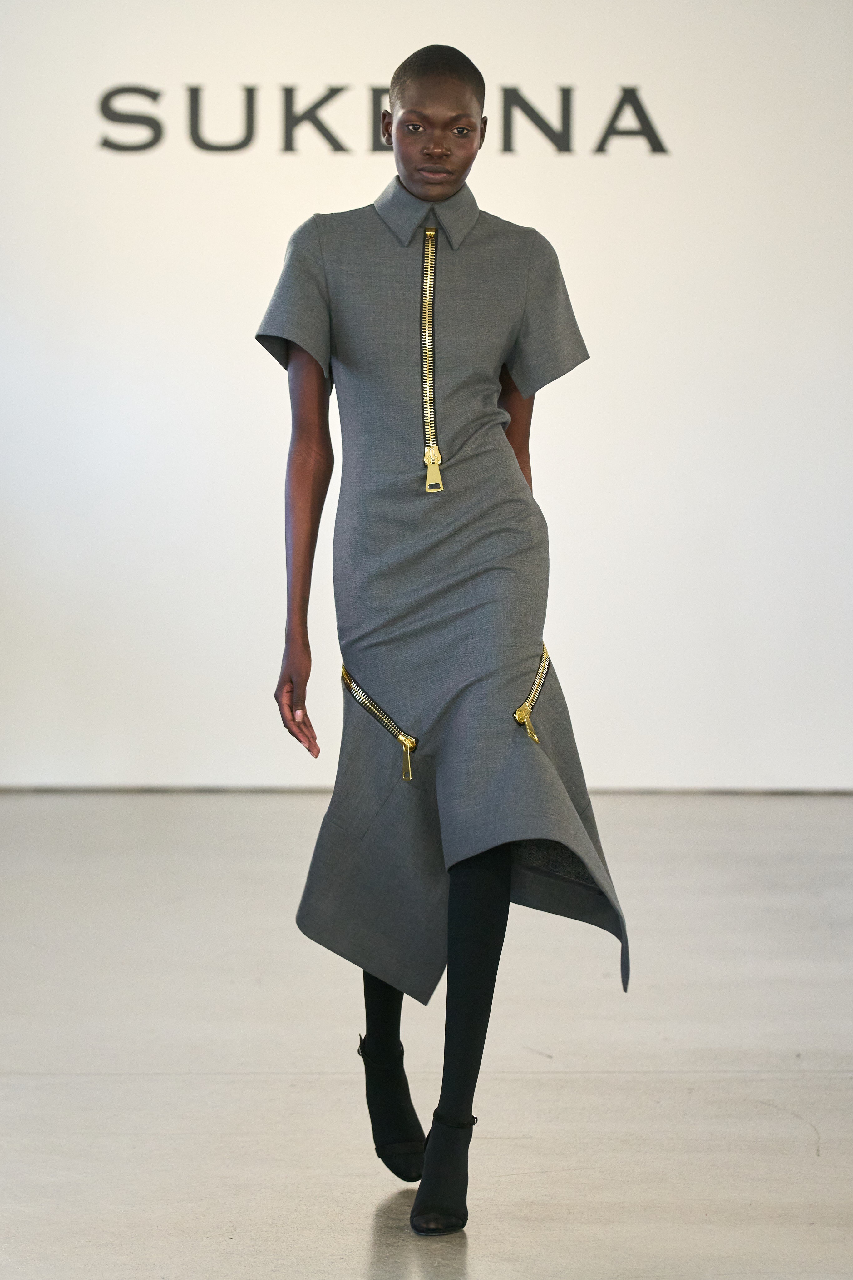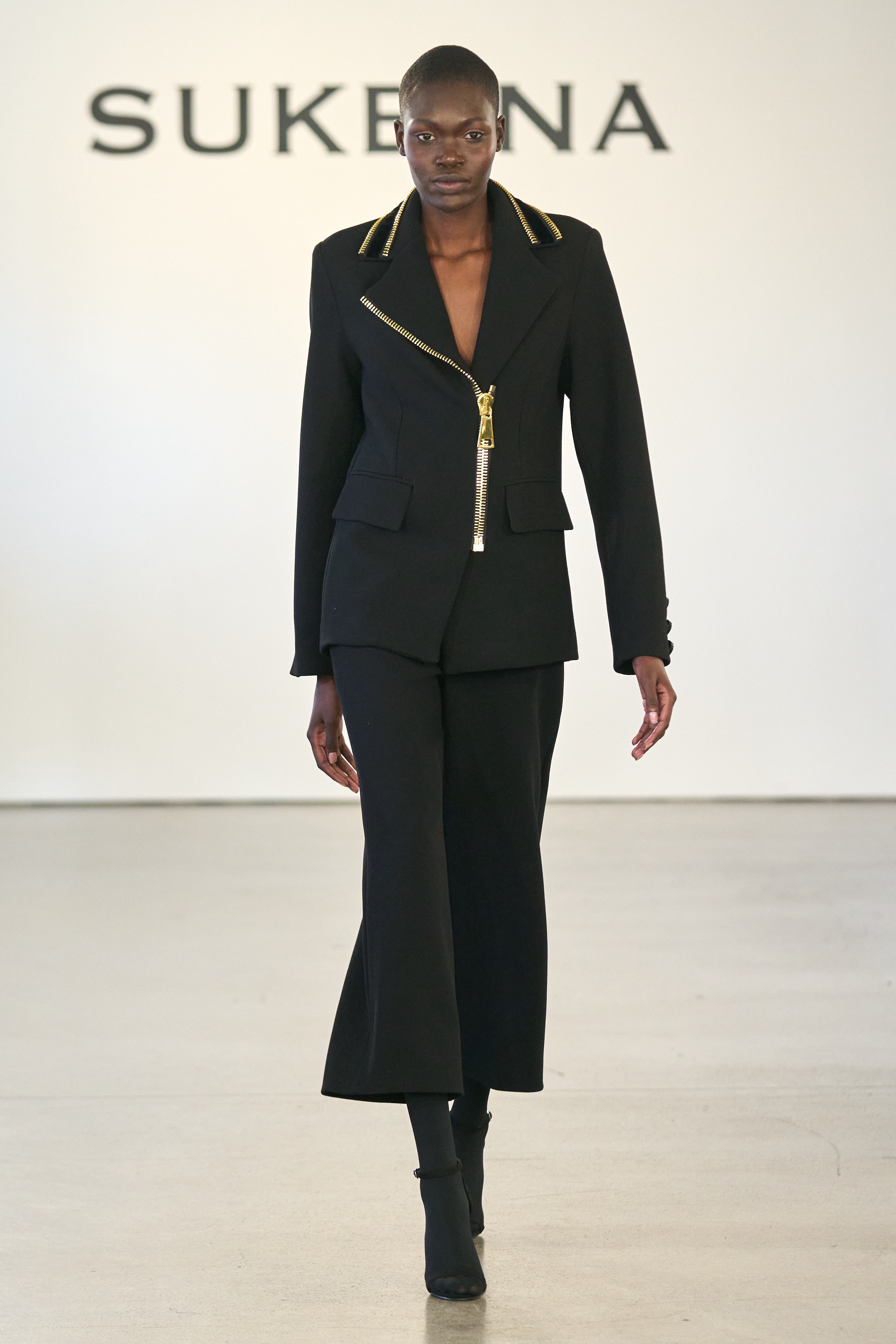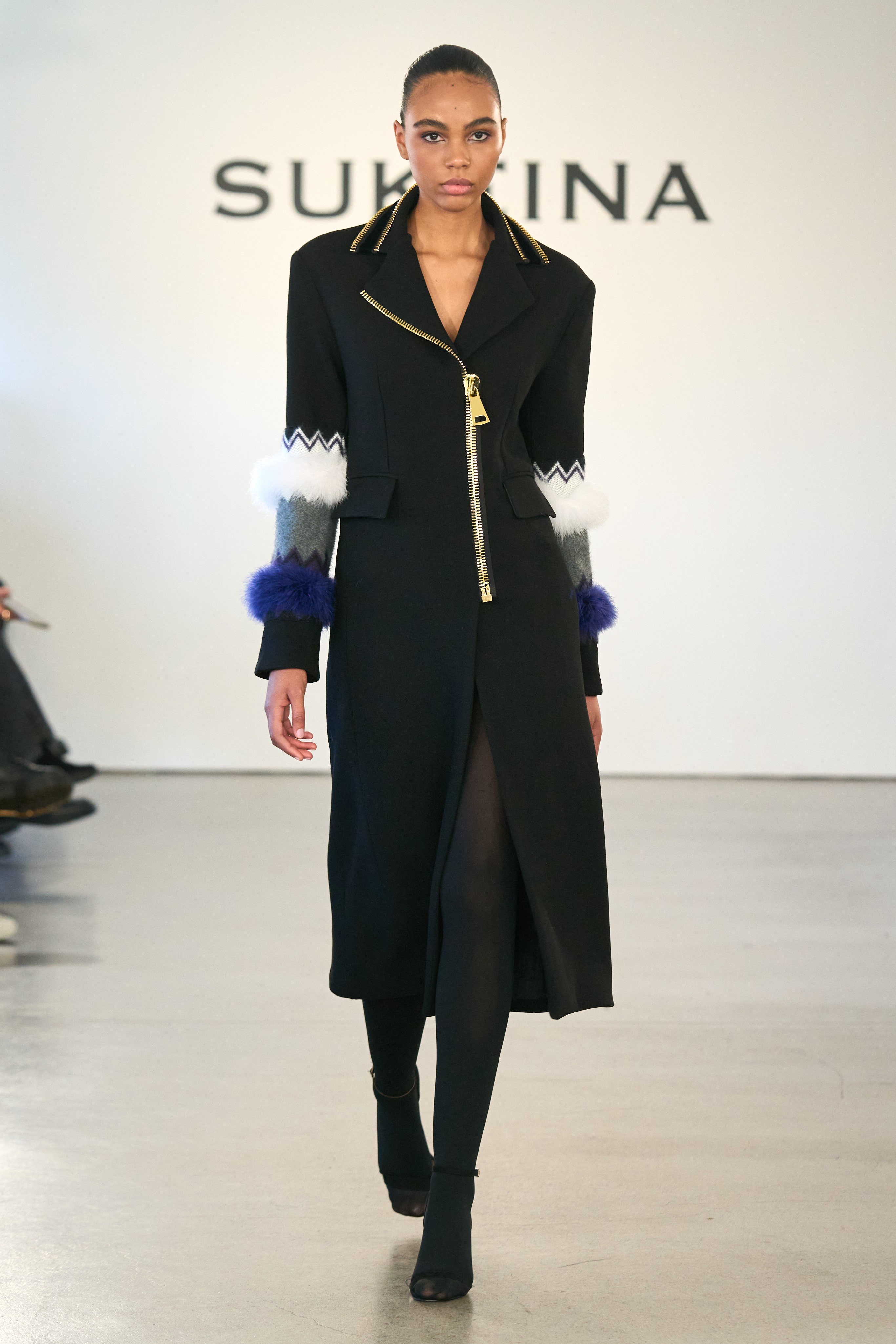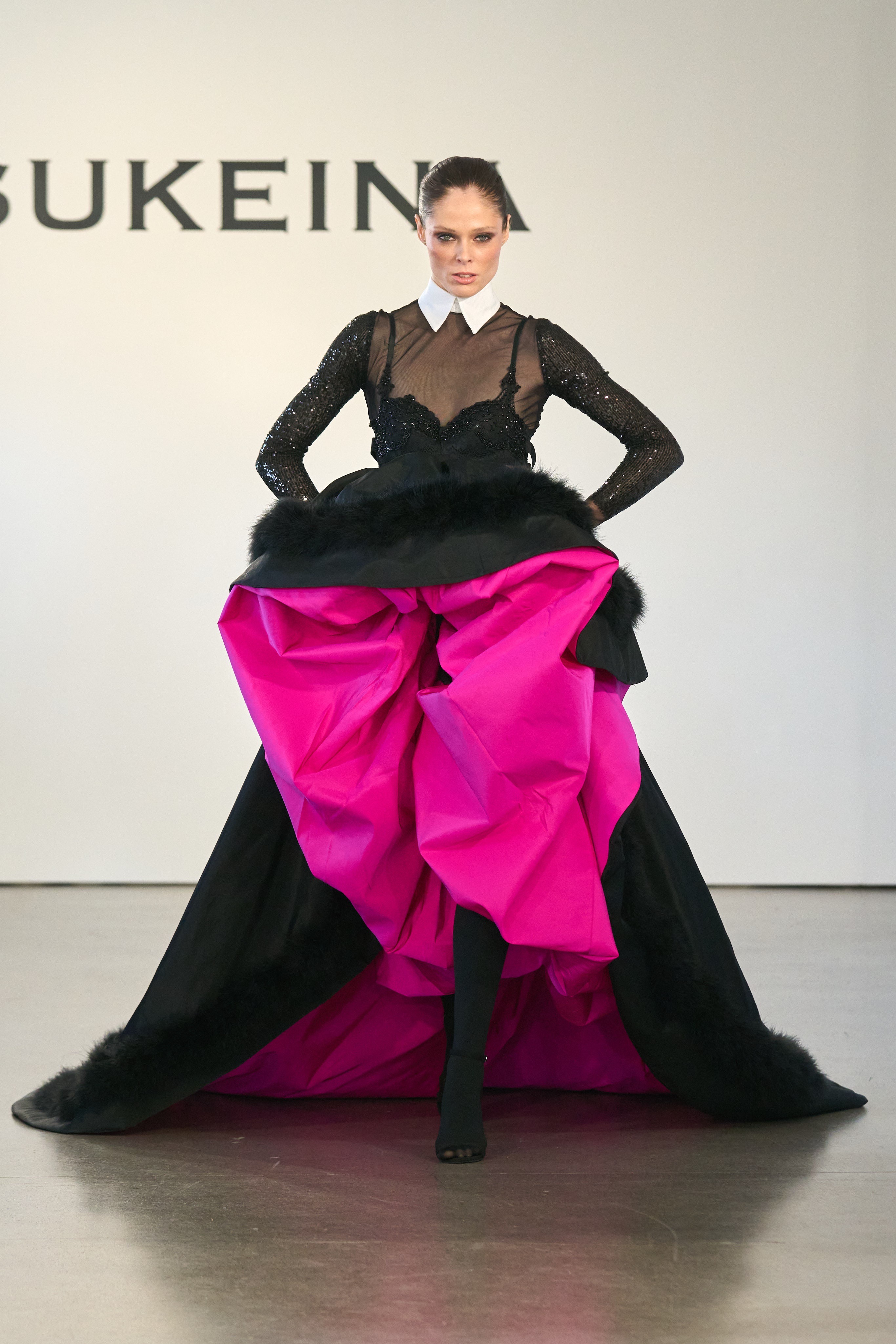 Coco Rocha closed the show in a black and fuchsia gown that didn’t spare any of the collection’s spotlighted details. Black fur lines the top of the confectionary skirt, and the sleeves are covered in sequin, while the crisp white collar speaks to the tailoring. Sukeina’s known in fashion as one of its “best kept secrets.” Here’s hoping this collection gets everybody talking out loud.