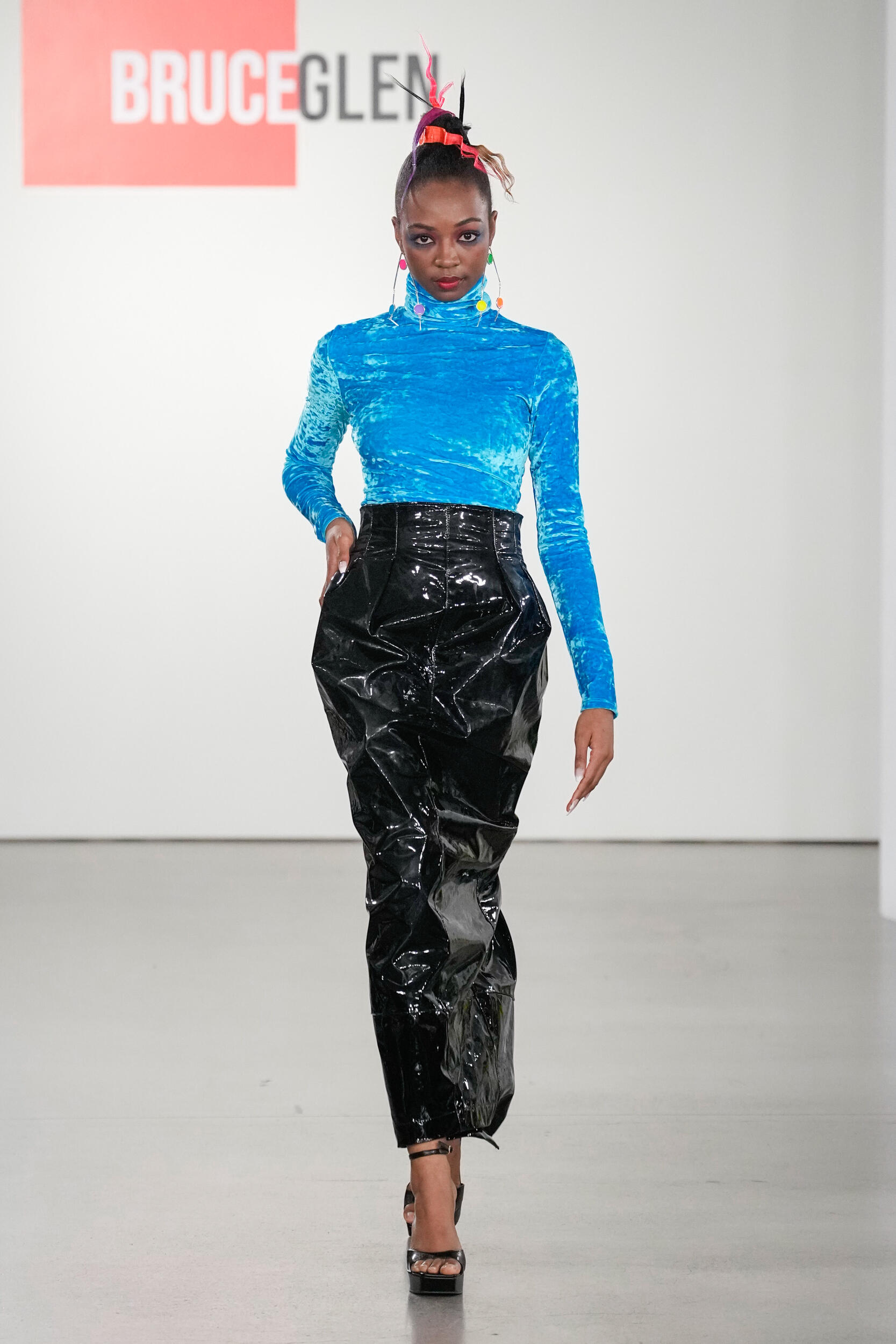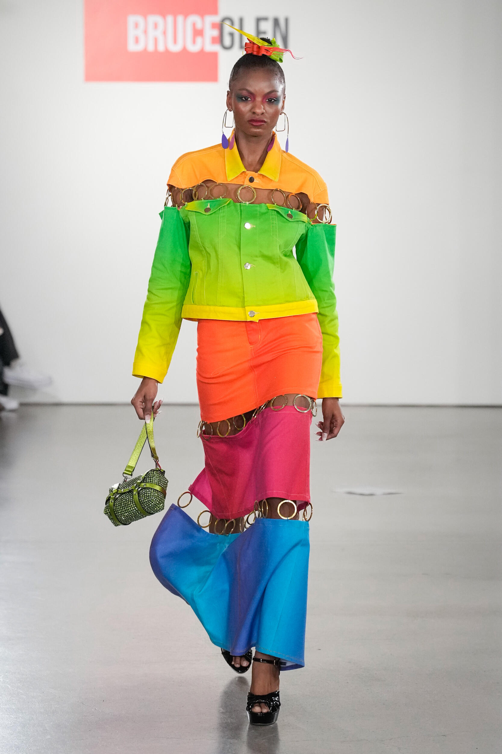Fall 2023 sees some familiar BruceGlen signatures ––like the Signal stripe and their recognizable use of ombre–– on a range of new styles like floor-length vests and spliced denim held together by gilded O rings.