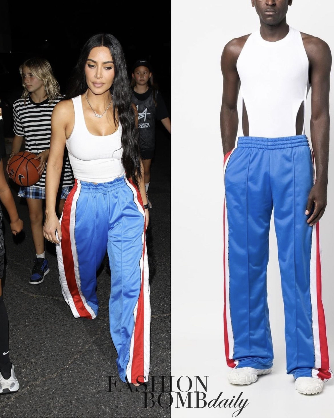 Kim’s cobalt blue Veterments track pants that had red and white stripes down the sides with snaps were the perfect go-to leisure pants to root her first born on. Similar to how the Vetermenets model featured the track pants, Kim wore a wife beater top and a diamond ‘Kim’ necklace that gave her a fresh and youthful vibe.
