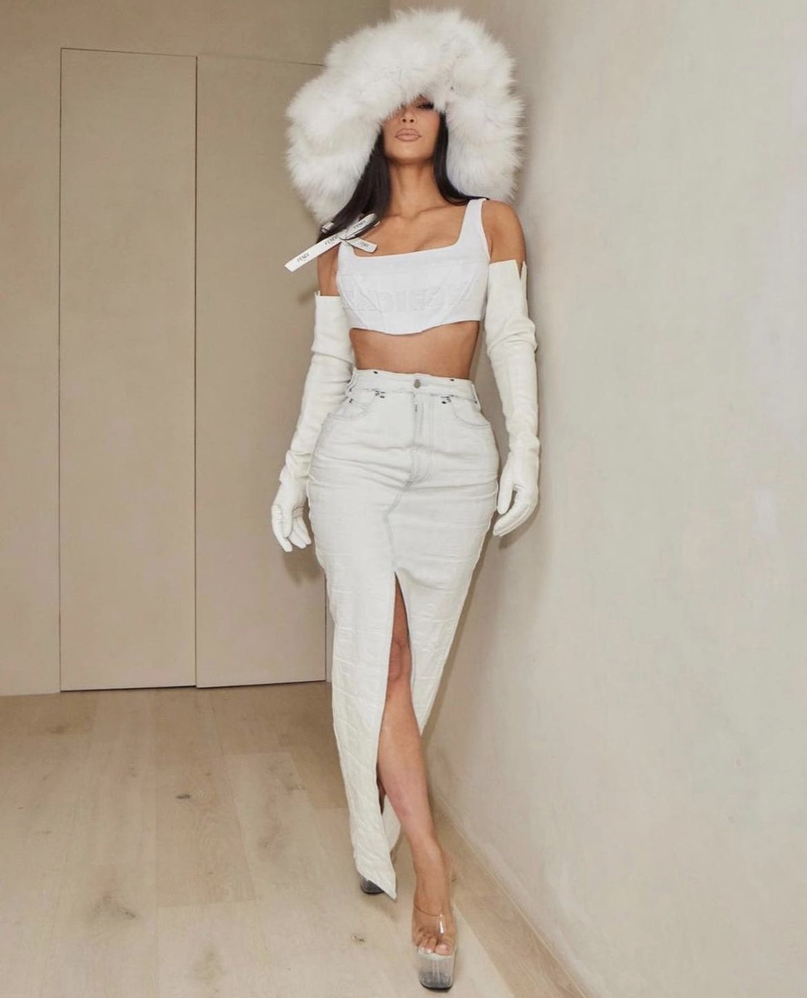Along with her strikingly beautiful statement hat, Kim paired her look with a white cropped corset that she styled with a light-blue denim skirt which was identical to what we saw on the runway previously. She chose to accessorized with white leather gloves and clear platform mules that showed her well-toned legs through the high-slit of her denim skirt.
