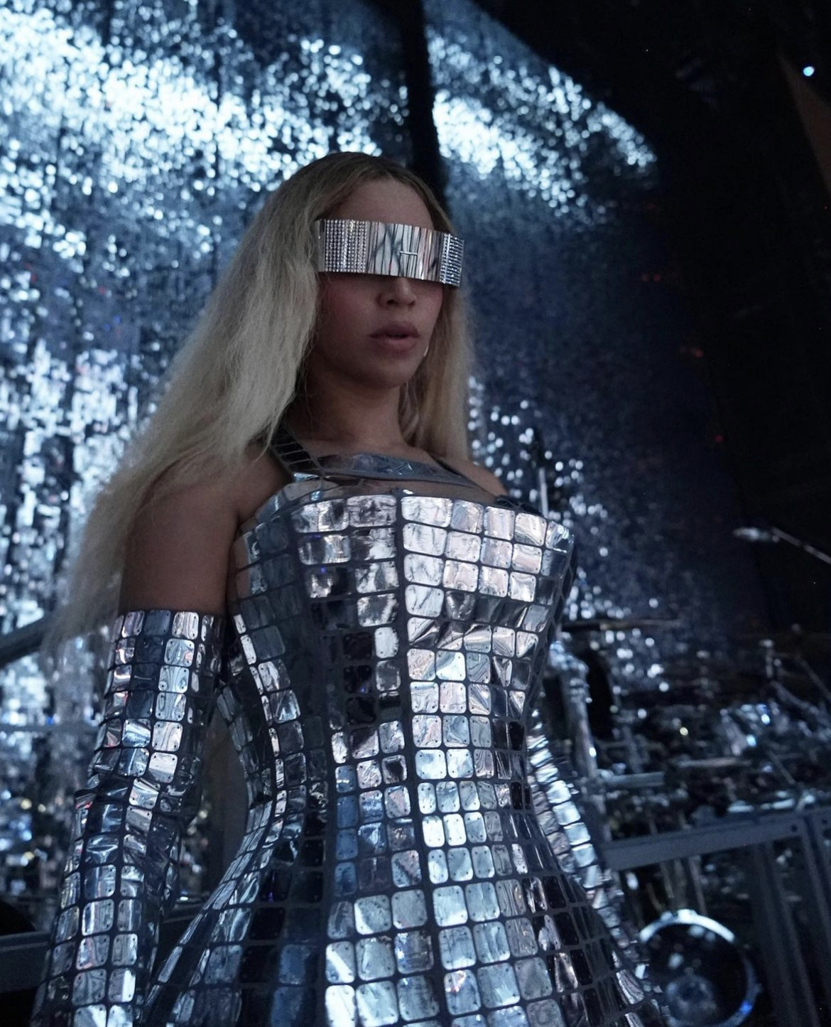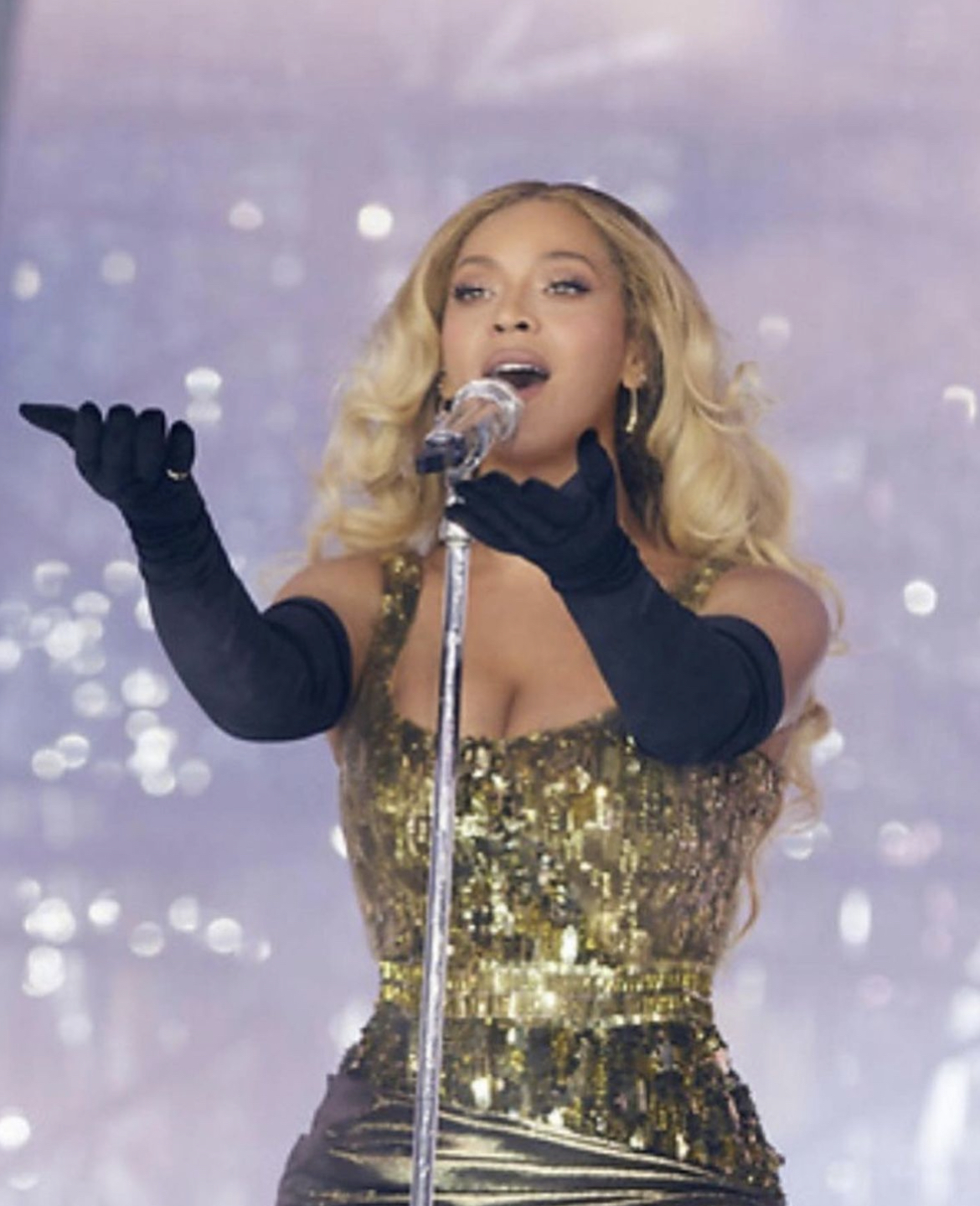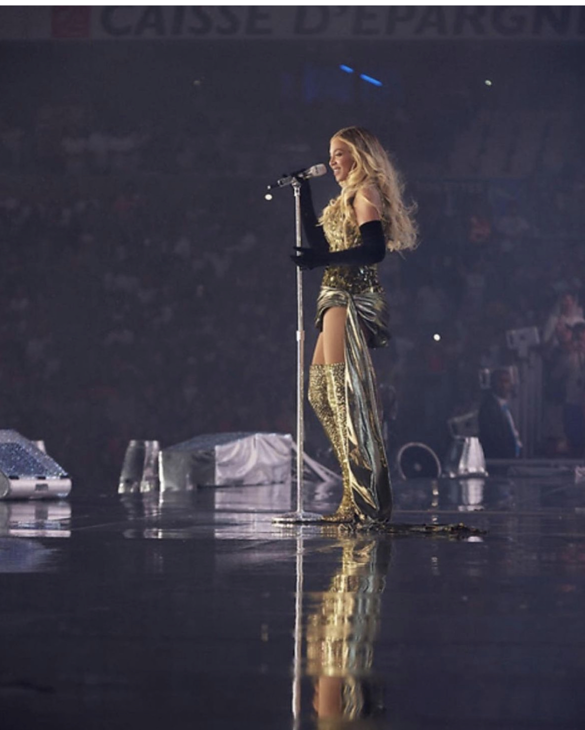 During her most recent performance in Marseille, France, the ‘Break My Soul’ singer stunned in a crushed crystal and gold sequin embroidered leotard by designer Alberta Ferretti that was finished with a gold draped mini skirt.
