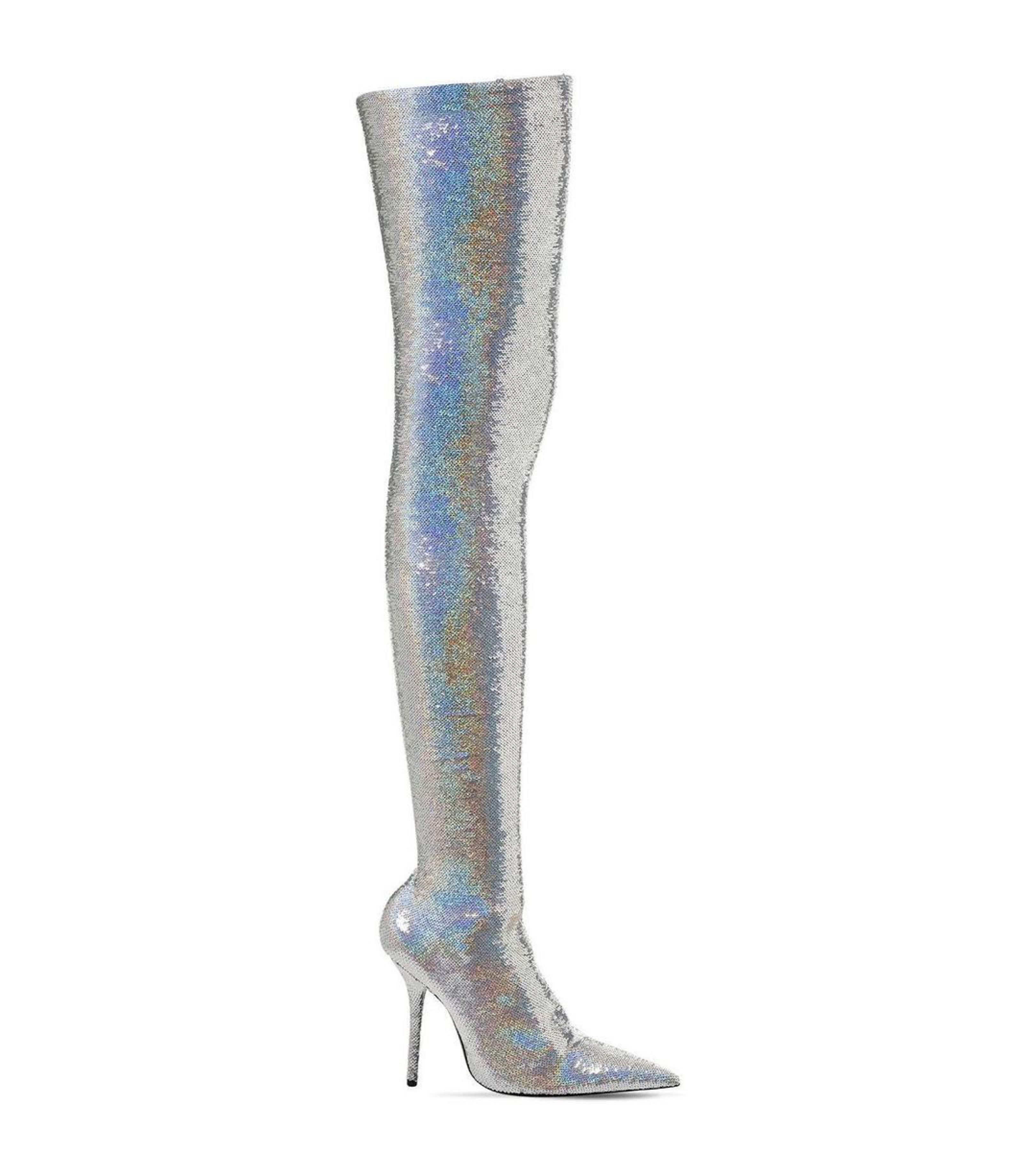 Her sparkling thigh high boots come equipped with the brand’s knife heel.