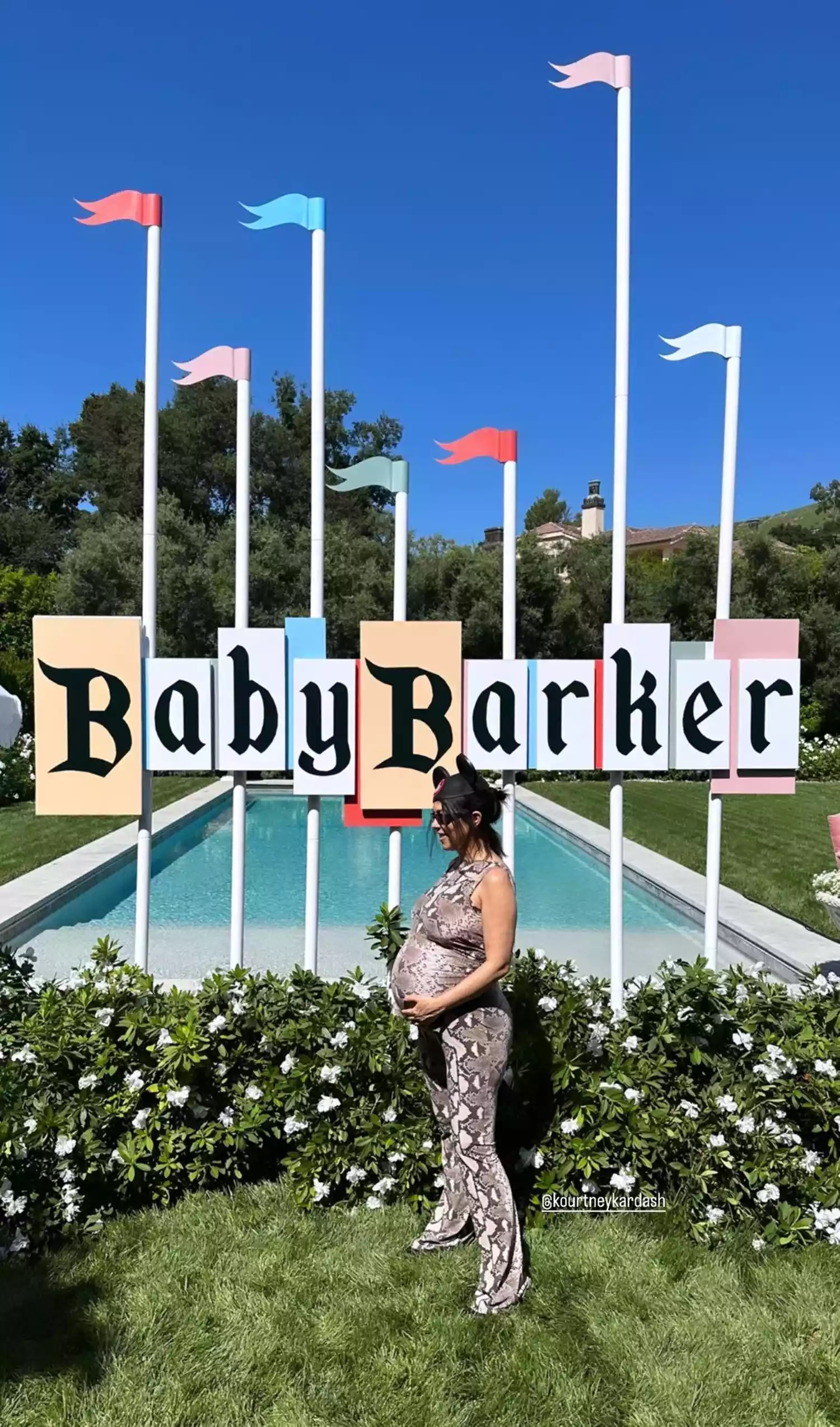While Kourtney clothed her baby bump in a snake print jumpsuit, she accessorized on theme with Mickey Mouse ears. However, with a family full of fashion icons, this sentimental event was one of celebration and style.