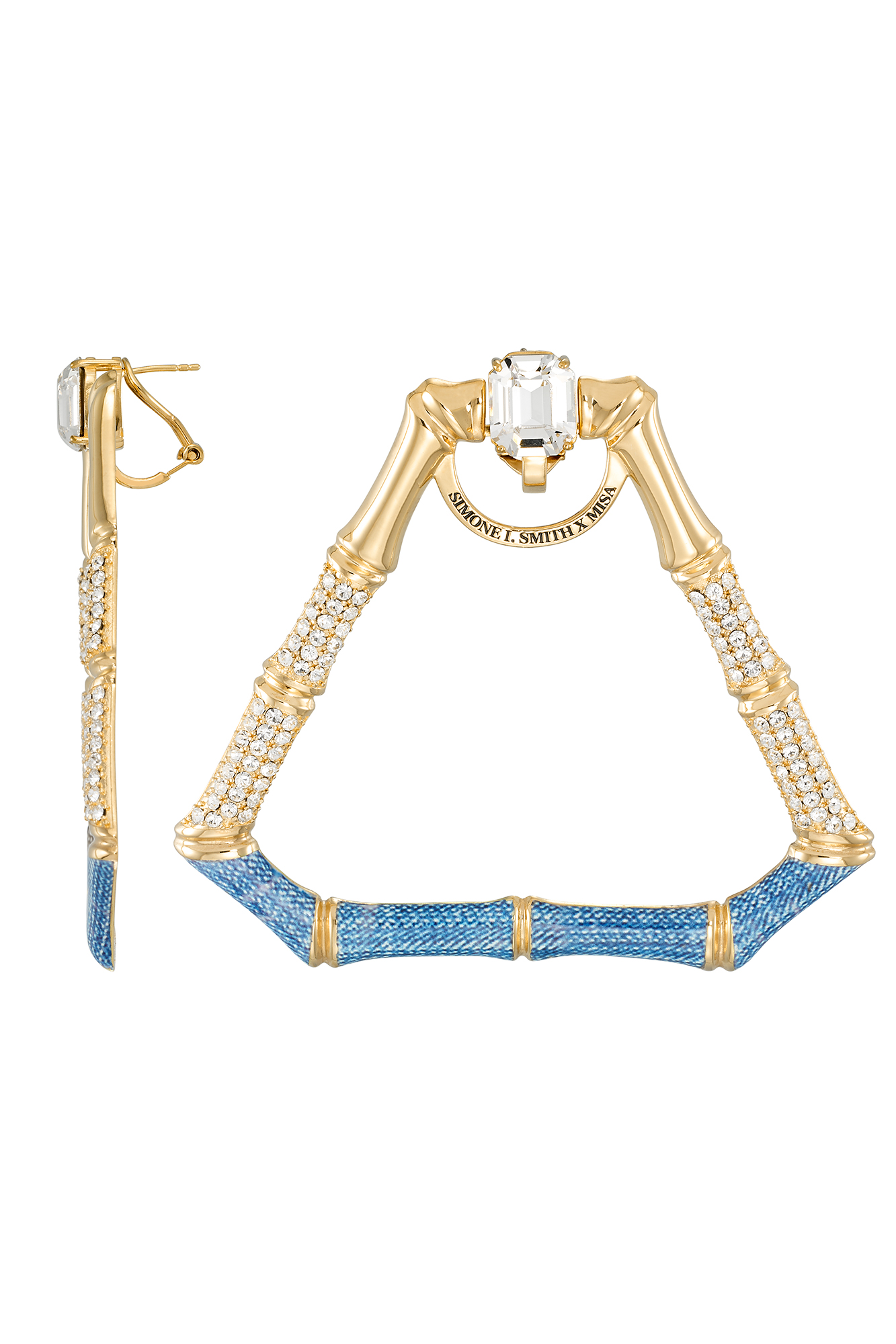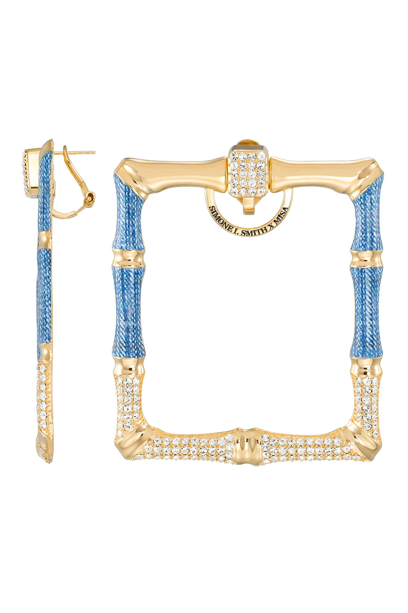 Both styles retail for $349 on Simoneismith.com and are 18K yellow gold plated. The hand-crafted denim enamel stations, adds exclusivity to these bamboo earrings.