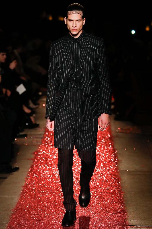 His suit was shown with an added short layer and red and stripe trousers on the runway.