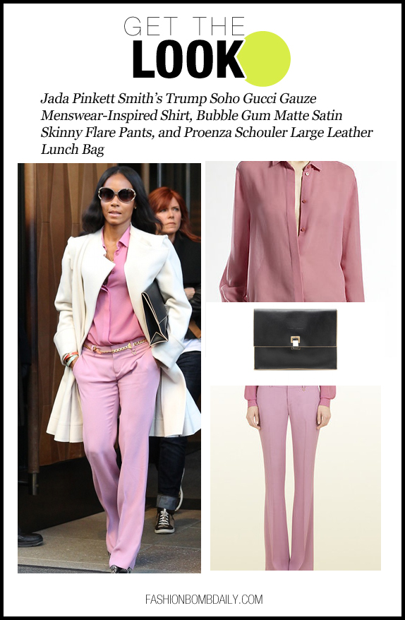 Her bubble gum-colored retro-inspired pants are crafted from envers satin and boast flare legs, and a skinny silhouette.