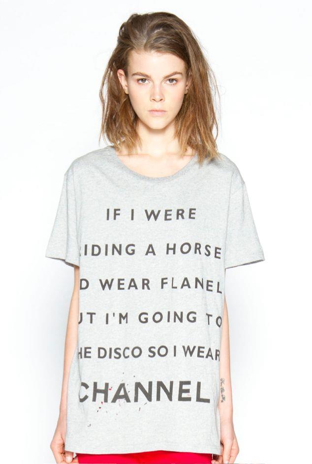 Her tee features the fun phrase, “If I were riding a horse I’d wear flannel, but I’m going to the disco so I wear Channel.” Poking fun at one of the world’s most popular brands are we?