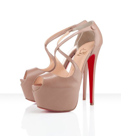 Her sandals feature a peep-toe silhouette, crisscross straps, covered platforms and sky-high 6.3″ heels.