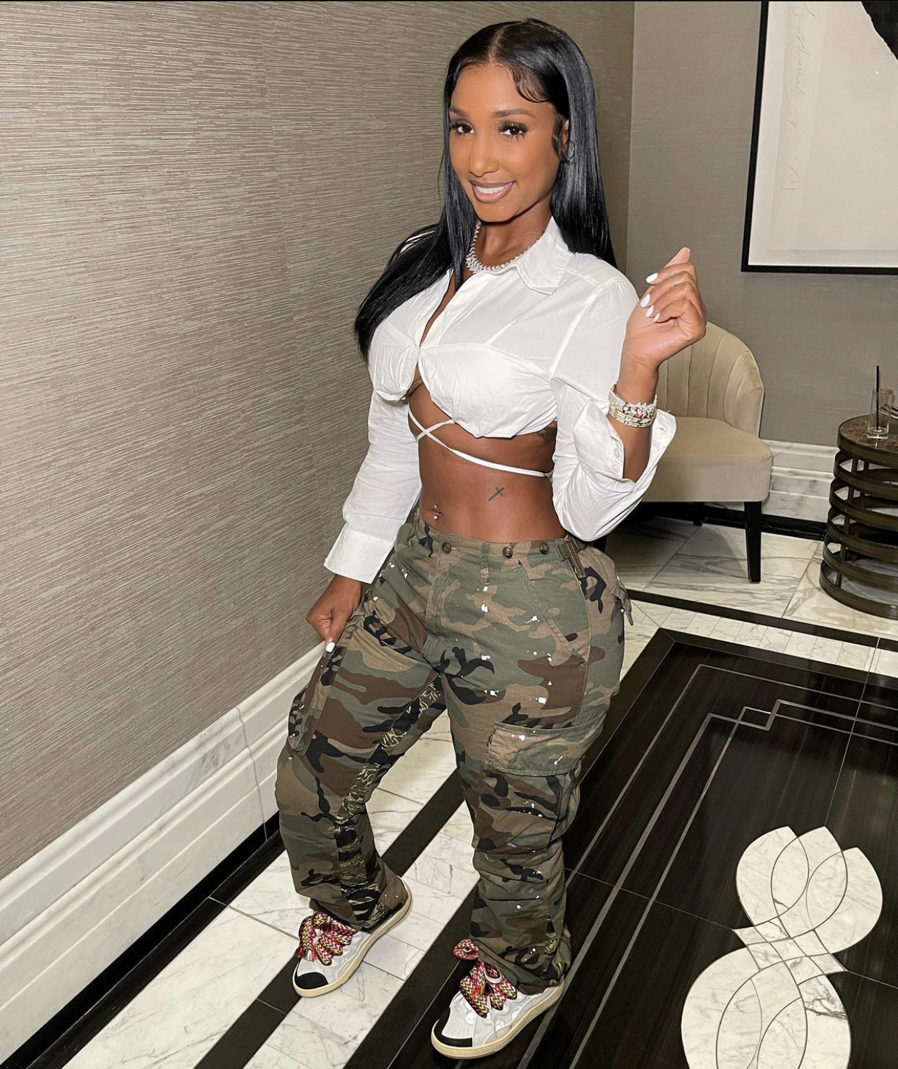Bernice wore the Not Here For Games Poplin Top with camouflage pants and Lanvin sneakers. She also rocked icy jewelry pieces to accompany the look.