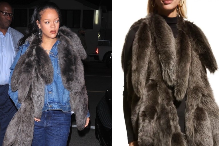 Celebrity Style Rihanna Steps Out at Giorgio Baldi in a Checked Gray Miu Miu Jacket, Balenciaga Skirt, and Amina Muaddi Snake Boots